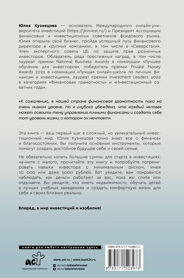 Эта книга — ваш первый шаг в сложный, но увлекательный инвестиционный мир. Юлия Кузнецова точно знает все о финансах и благосостоянии. Вы получите основные инструменты, которые помогут создать достойное будущее себе и своей семье. Не обязательно копить большие суммы для старта в инвестициях: начните с малого, прочитайте эту книгу и попробуйте потренировать навыки инвестора с минимальным риском, имея 10 000 или даже 5000 рублей. Вот увидите, вам понравится наблюдать, как деньги работают за вас, пока вы спите или отдыхаете. Вы увидите, что иметь недвижимость, обучать детей в лучших учебных заведениях и создать комфортную жизнь для себя и своих близких реально.