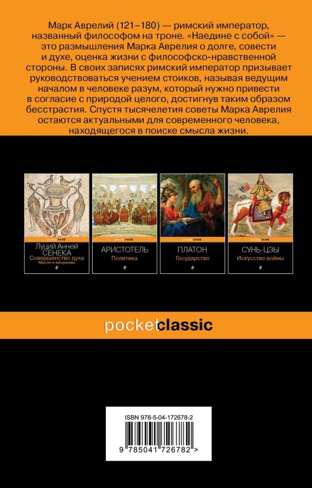 «Наедине с собой» — это размышления римского императора Марка Аврелия о долге, совести и духе, оценка жизни с философско-нравственной стороны. В своих записях римский император призывает руководствоваться учением стоиков, но и развивать его дальше, назвав ведущим началом в человеке не душу, но разум, который нужно привести в согласие с природой целого, достигнув таким образом бесстрастия.