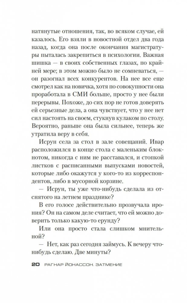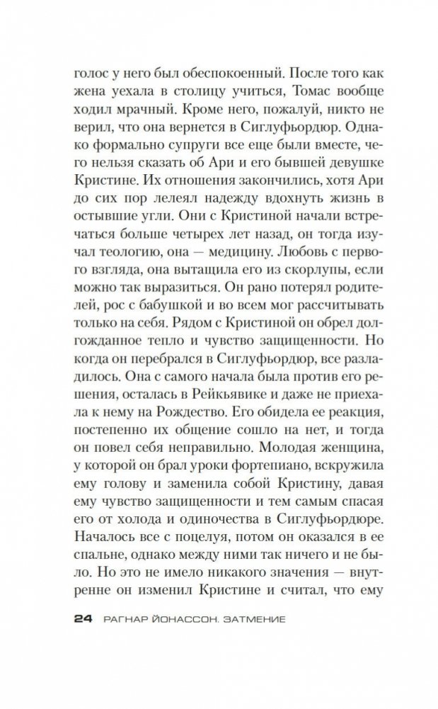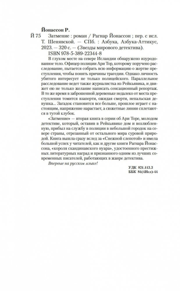 В глухом месте на севере Исландии обнаружено изуродованное тело. Офицер полиции Ари Тор, которому поручено расследование, пытается собрать всю информацию о жертве преступления, чтобы понять причины трагедии. Однако личность убитого интересует не только полицейского. Параллельное расследование ведет также журналистка из Рейкьявика, и движет ею не только желание написать сенсационный репортаж. В то же время в заброшенной деревеньке недалеко от места преступления томится взаперти, ожидая смерти, непальская девушка… Загадок становится все больше, прошлое играет с настоящим, напряжение нарастает, а сюжетные линии сплетаются в тугой клубок. «Затмение» — вторая книга в серии об Ари Торе, молодом детективе, который, оставив в Рейкьявике дом и возлюбленную, прибыл на службу в полиции в небольшой городок на севере страны, отрезанный от остального мира суровой природой. Книга вышла сразу вслед за «Снежной слепотой» и имела большой успех у читателей, как и другие книги Рагнара Йонассона, «короля скандинавского нуара», удостоенного престижных литературных наград и признанного одним из лучших современных писателей, работающих в жанре детектива. Впервые на русском языке!