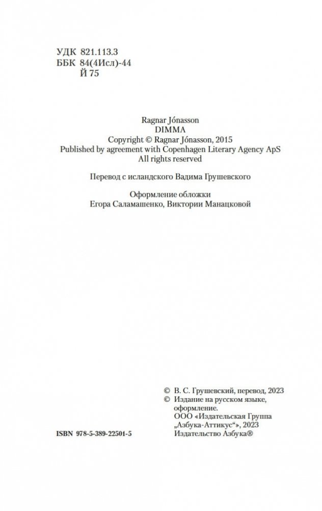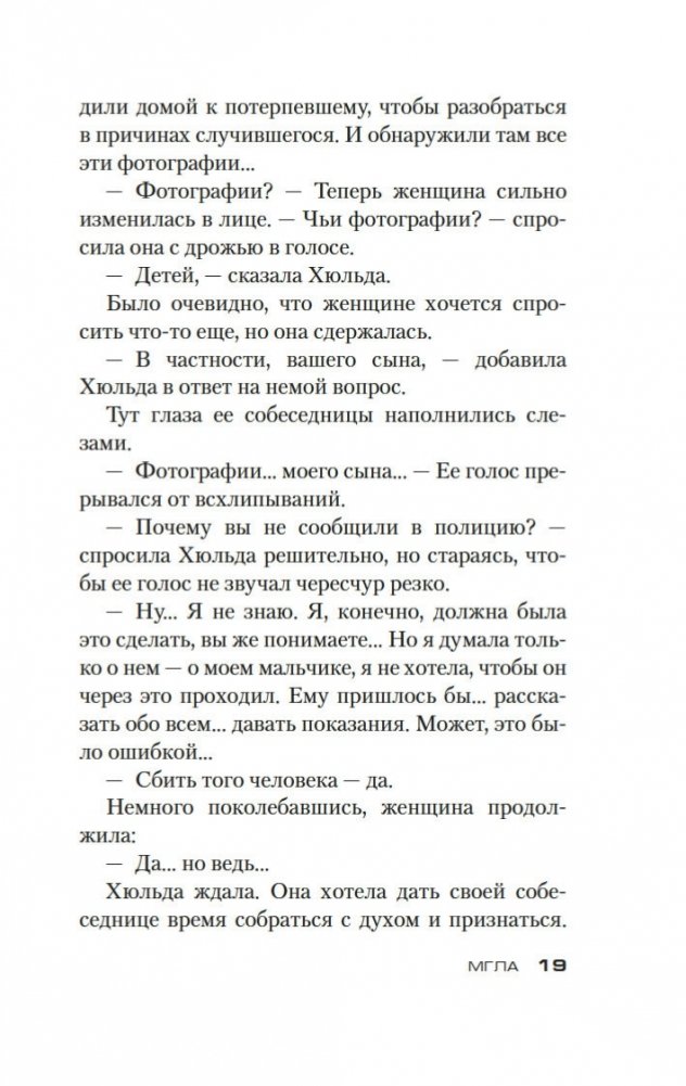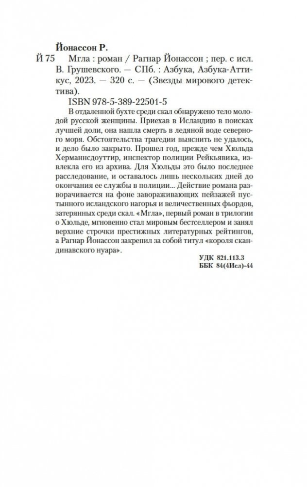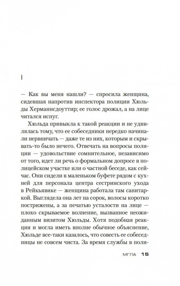 В отдаленной бухте среди скал обнаружено тело молодой русской женщины. Приехав в Исландию в поисках лучшей доли, она нашла смерть в ледяной воде северного моря. Обстоятельства трагедии выяснить не удалось, и дело было закрыто. Прошел год, прежде чем Хюльда Херманнсдоуттир, инспектор полиции Рейкьявика, извлекла его из архива. Для Хюльды это было последнее расследование, и оставалось лишь нескольких дней до окончания ее службы в полиции… Действие романа разворачивается на фоне завораживающих пейзажей пустынного исландского нагорья и величественных фьордов, затерянных среди скал. «Мгла», первый роман в трилогии о Хюльде, мгновенно стал мировым бестселлером и занял верхние строчки престижных литературных рейтингов, а Рагнар Йонассон закрепил за собой титул «короля скандинавского нуара».