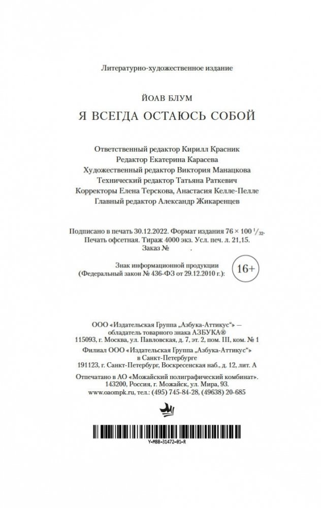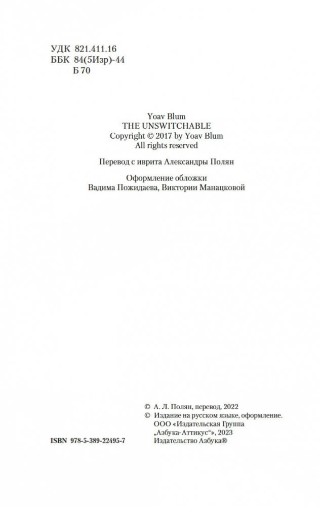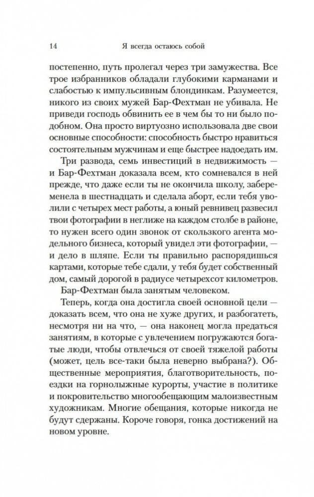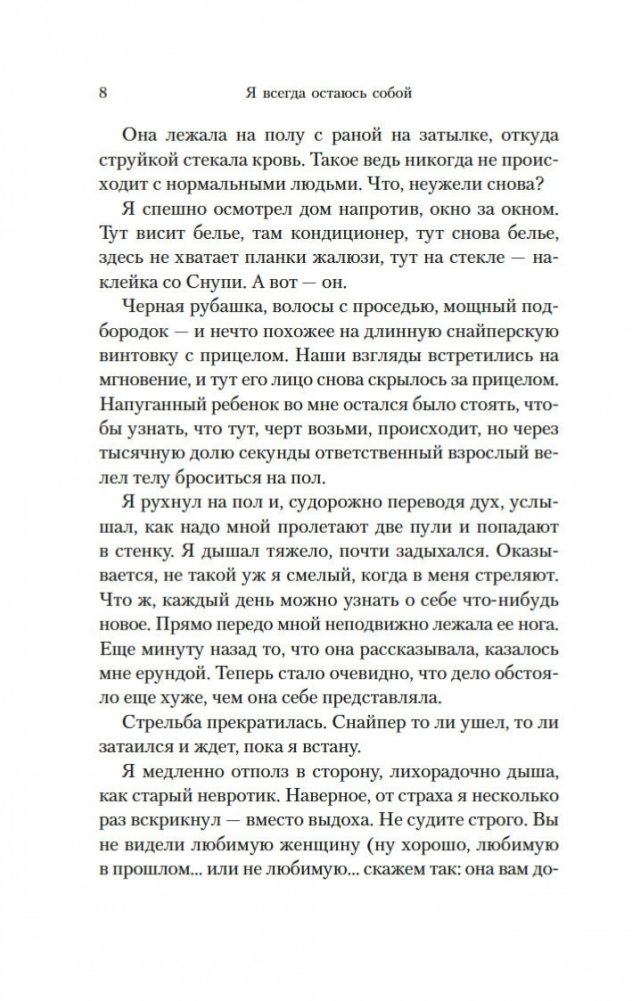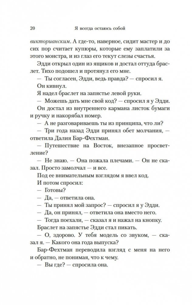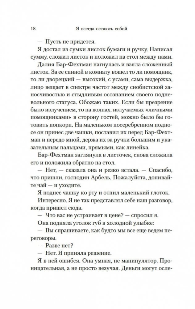 «Я вынужден смотреть на все только своими глазами». Его зовут Дан Арбель, и он живет в мире, который никогда не будет прежним. Гениальное изобретение изменило этот мир навсегда. Ни один человек больше не привязан к своему телу. Простым нажатием кнопки он может оказаться в теле другого. Нет необходимости лететь в Таиланд — достаточно обменяться телами с тем, кто отдыхает на тайском пляже. Необязательно объяснять врачу свои симптомы: врач может на несколько секунд оказаться в вашем теле и узнать все, что нужно. Бесполезно тратить время на фитнес, куда удобнее одолжить свое тело тренеру. Мир никогда не будет прежним, однако Дана Арбеля это не касается. Он — единственный в мире человек, неспособный меняться телами. Что это — врожденный порок, божественное благословение или ужасное проклятие? Роман Йоава Блума «Я всегда остаюсь собой» получил одну из самых престижных литературных премий Израиля — премию Геффена.