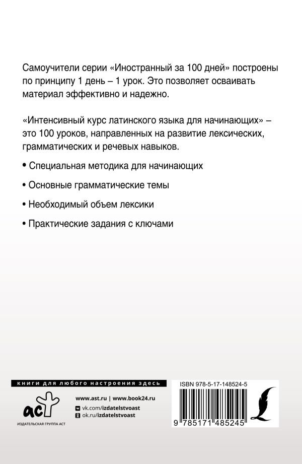 Данное учебное издание содержит лексический и грамматический материал для изучения латинского языка с нулевого уровня. Курс разбит на 100 уроков, на изучение каждого потребуется 1 день. Для закрепления теории, отработки языковых навыков и употребления единиц в речи предлагается большое количество упражнений с ключами.