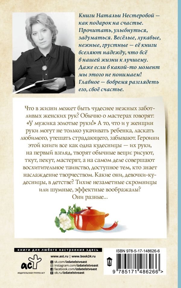 Что в жизни может быть чудеснее нежных заботливых женских рук? Не трудитесь — придумать невозможно! Обычно о мастерах говорят: "У мужика золотые руки!" А то, что и у женщин руки могут не только укачивать ребенка, ласкать любимого, утешать страдающего, забывают. Героини этой книги все как одна кудесницы — их руки, на первый взгляд, творят обычные вещи: рисуют, ткут, пекут, мастерят, а на самом деле совершают восхитительное таинство, доступное тем, кто знает наслаждение творчеством. Мастеровому человеку нелегко добиться признания, а если этот человек женщина, то ему нелегко вдвойне. Счастье, если рядом оказывается спутник, чья любовь спаяна с восхищением талантом избранницы. Какие они, девочки-кудесницы, в детстве? Тихие незаметные скромницы или шумные, эффектные воображалы? Они разные…