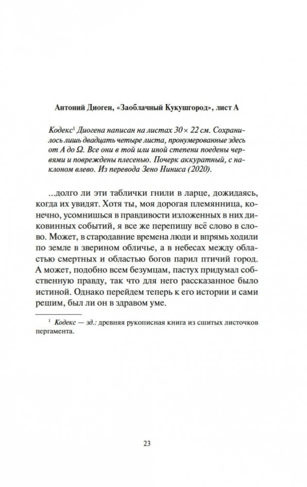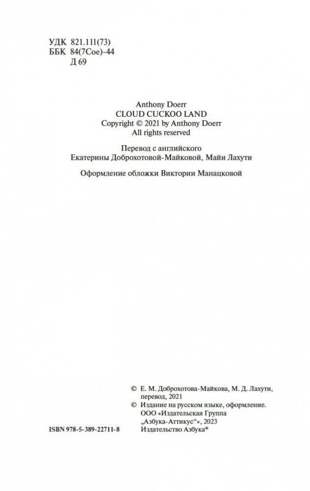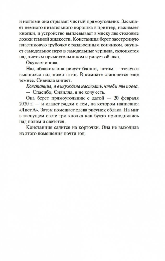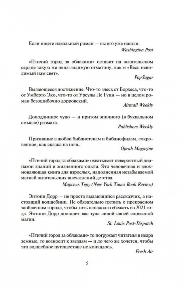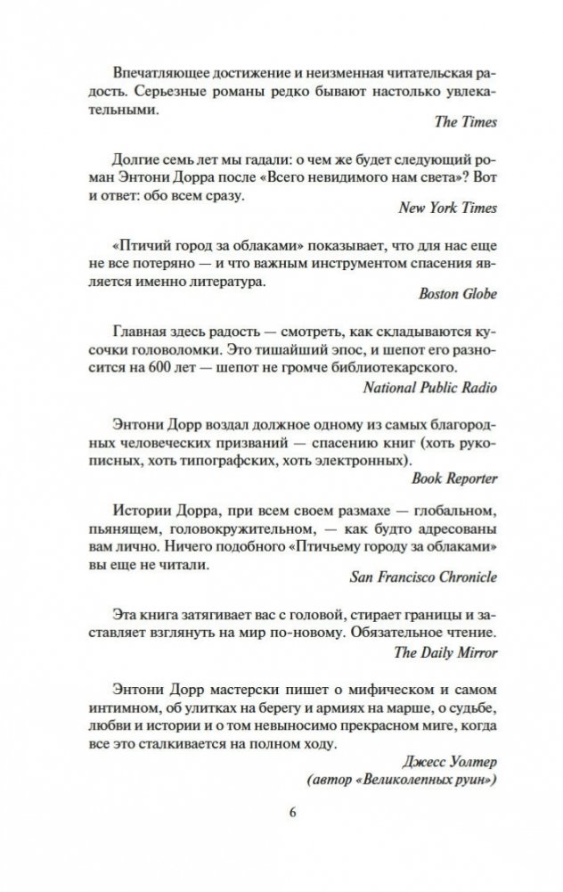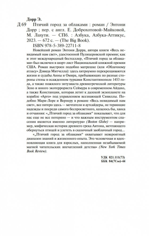 Новейший роман Энтони Дорра, автора книги «Весь невидимый нам свет», удостоенной Пулицеровской премии; как и этот международный бестселлер, «Птичий город за облаками» был включен в шорт-лист Национальной книжной премии США. Роман выстроен подобно матрешке (или «Облачному атласу» Дэвида Митчелла): здесь хитроумно перекрещиваются жизни и судьбы Анны и Омира, пребывающих по разные стороны стены в осажденном турками Константинополе 1453 года, а также пожилого энтузиаста древнегреческой литературы Зено и юного экотеррориста Сеймура в современном Айдахо, а также Констанции, которая летит к далекой экзопланете на корабле «Арго» под управлением всезнающей Сивиллы. Подобно Мари-Лоре и Вернеру в романе «Весь невидимый нам свет», все пятеро здесь — мечтатели и аутсайдеры, не теряющие надежды и посреди самого беспросветного, казалось бы, хаоса и отчаяния: «„Птичий город за облаками“ показывает, что для нас еще не все потеряно — и что важным инструментом спасения является именно литература» (Boston Globe) — например, мифическая история древнего грека Аитона, мечтающего обернуться птицей и улететь в сказочный заоблачный город… «„Птичий город за облаками“ охватывает невероятный диапазон знаний и жизненного опыта. Это человечная и вдохновляющая книга для взрослых, наполненная незабываемой магией читательских впечатлений детства» (New York Times Book Review).