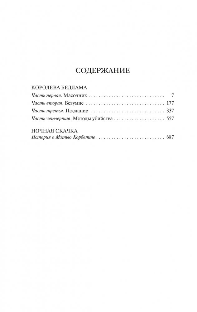 «Сказано: чем клясть темноту, лучше зажги свечу. Однако летом 1702 года в городе Нью-Йорке без проклятий не обходилось, ибо свечи были малы, а темнота велика». Итак, добро пожаловать в колониальный Нью-Йорк, еще недавно бывший голландским поселением Новый Амстердам. Город — все 5000 жителей — с волнением ожидает прибытия нового губернатора (по слухам, близкого родственника ее величества королевы Англии). А Мэтью Корбетту, секретарю мирового судьи, не дает покоя загадка серийного убийцы по прозванию Масочник. И похоже, что ключ к его личности хранит живущая в далеком приюте для умалишенных пожилая леди, известная как Королева Бедлама… «Увлекательный исторический детектив от автора, который мог потягаться на его поле с самим „королем ужасов“ Стивеном Кингом» (Publishers Weekly) публикуется в новом переводе. Также в книгу входит повесть «Ночная скачка», действие которой происходит вскоре после событий «Королевы Бедлама».