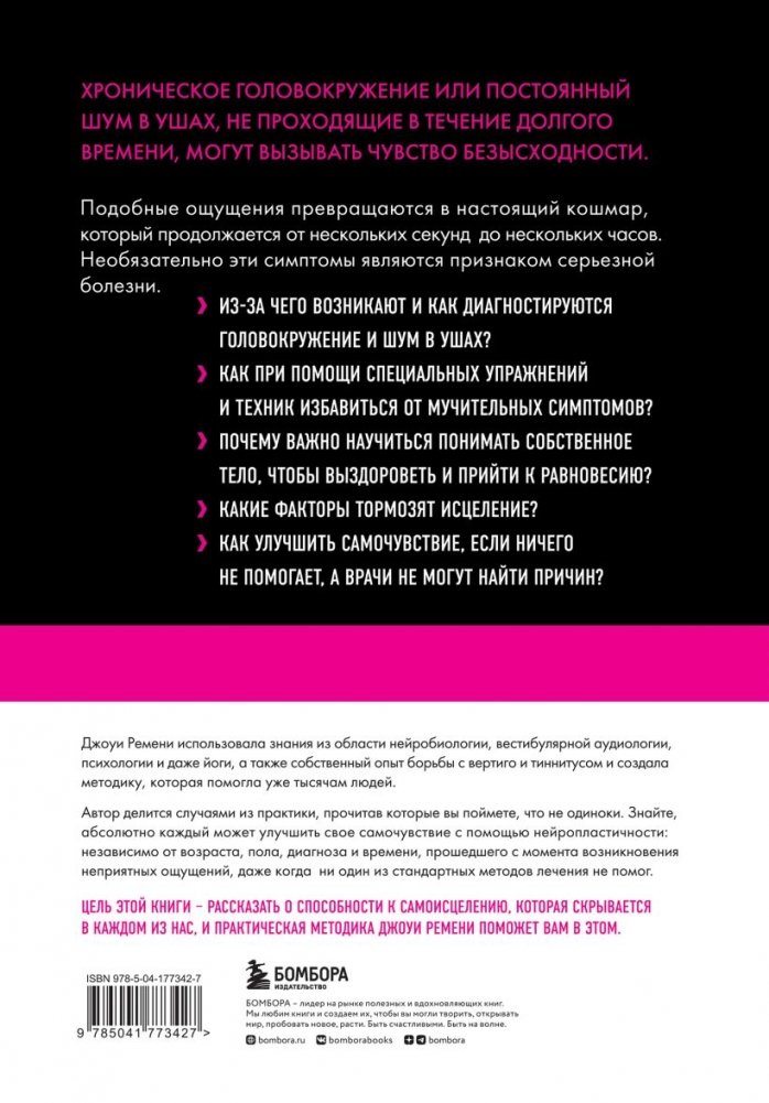 При создании методики, представленной в книге, Джоуи Ремени учитывала не только знания из области нейробиологии, вестибулярной аудиологии, психологии и даже йоги, но и собственный опыт борьбы с вертиго и тиннитусом, а также опыт своих пациентов. Автор расскажет, как научиться понимать сигналы своего тела, как формируются новые нейронные связи, как облегчить мучительные симптомы и прийти к равновесию.