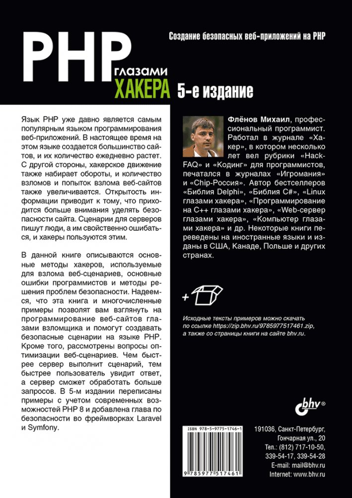 Рассмотрены вопросы безопасности и оптимизации сценариев на языке PHP. Большое внимание уделено описанию типичных ошибок программистов, благодаря которым, хакеры проникают на сервер, а также представлены методы и приведены практические рекомендации противостояния внешним атакам. Показаны реальные примеры взлома Web-сайтов и рекомендации, которые помогут создавать более защищенные сайты. В 5-м издании переписаны примеры с учетом современных возможностей PHP 8 и добавлена глава по безопасности во фреймворках Laravel и Symfony.