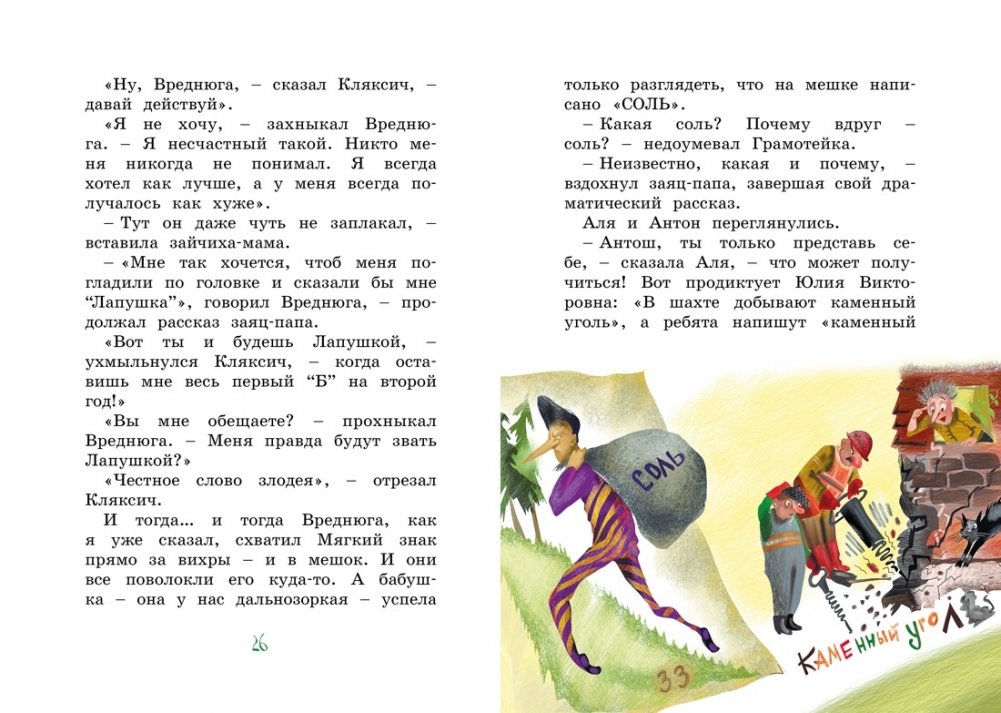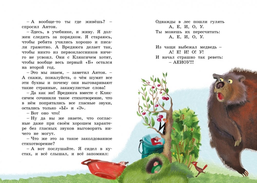 Главные герои повести-сказки «Аля, Кляксич и Вреднюга» первоклассники Аля и Антон чудесным образом оказались... в учебнике русского языка. Ой, что там творилось! Все буквы перепутались, и начался такой переполох! Ребятам предстоит во всём разобраться, навести порядок, а поможет им в этом очень важном деле смышлёный и весёлый Грамотейка.