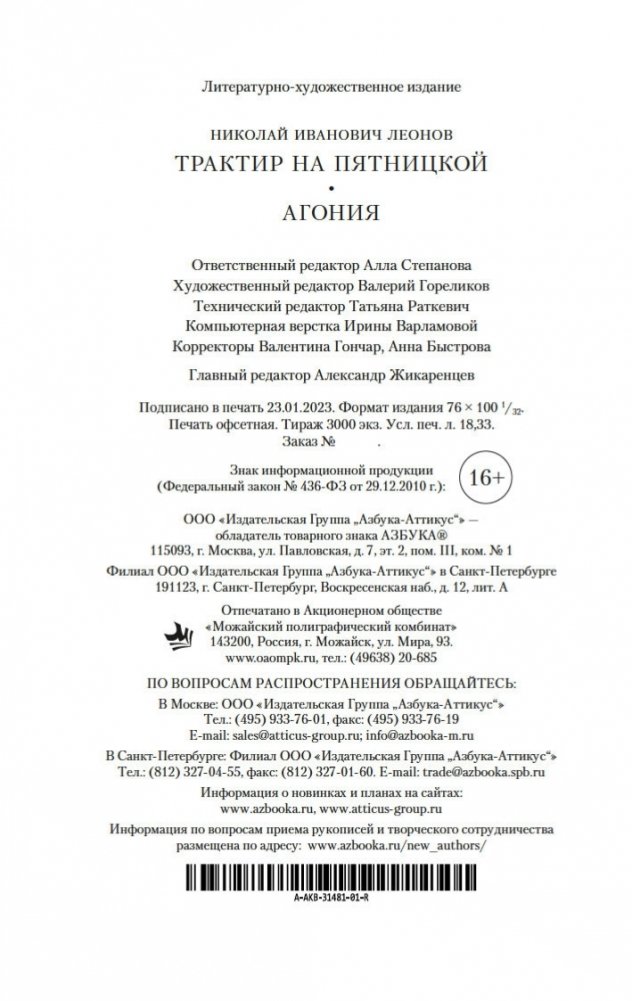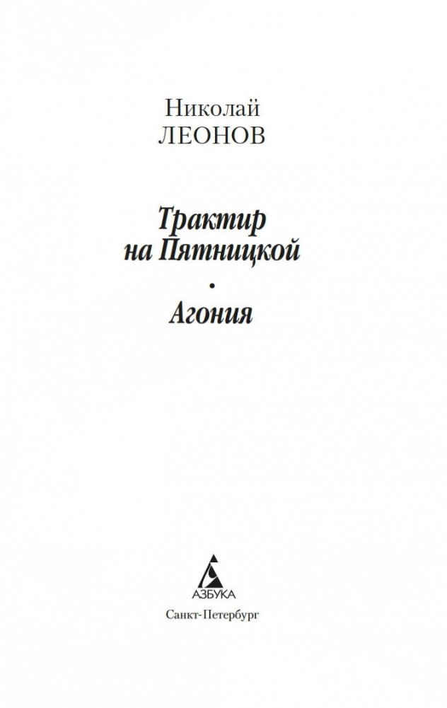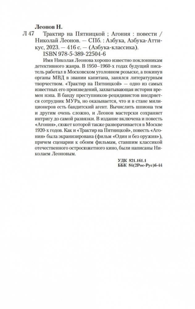 Имя Николая Леонова хорошо известно поклонникам детективного жанра. В 1950–1960-х годах будущий писатель работал в Московском уголовном розыске, а покинув органы МВД в звании капитана, занялся литературным творчеством. «Трактир на Пятницкой» — одно из самых известных его произведений, захватывающая история времен нэпа. В банду преступников-рецидивистов внедряется сотрудник МУРа, но оказывается, что и в стане милиционеров есть бандитский агент. Вычислить шпиона тем и другим очень сложно, и Леонов мастерски сохраняет интригу до самой развязки. В издание включена и повесть «Агония», сюжет которой также разворачивается в Москве 1920-х годов. Как и «Трактир на Пятницкой», повесть «Агония» была экранизирована (фильм «Один и без оружия»), причем сценарии к обоим фильмам, ставшим классикой отечественного остросюжетного кино, были написаны Николаем Леоновым.