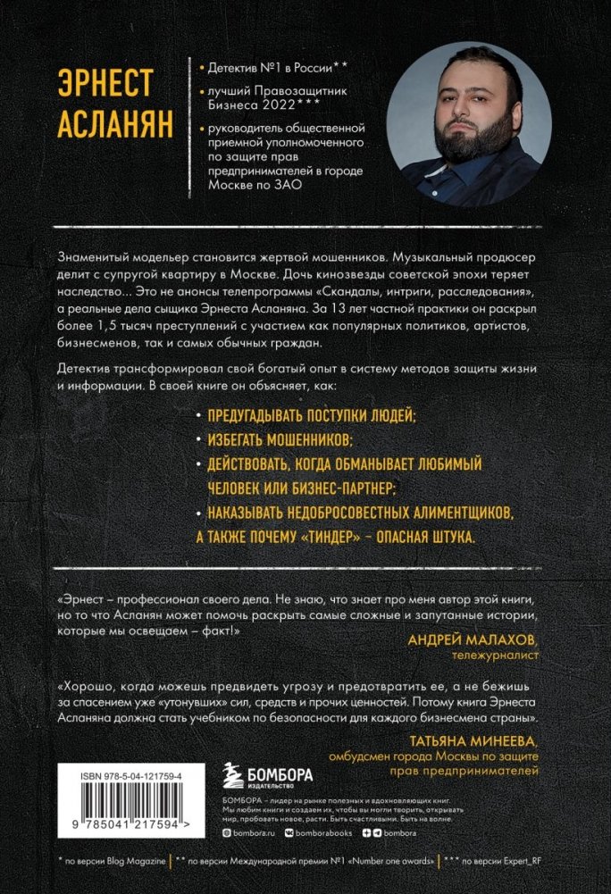 «Эрнест — профессионал своего дела. Не знаю, что знает про меня автор этой книги, но то что Асланян может помочь раскрыть самые сложные и запутанные истории, которые мы освещаем, — факт!» — Андрей Малахов, тележурналист