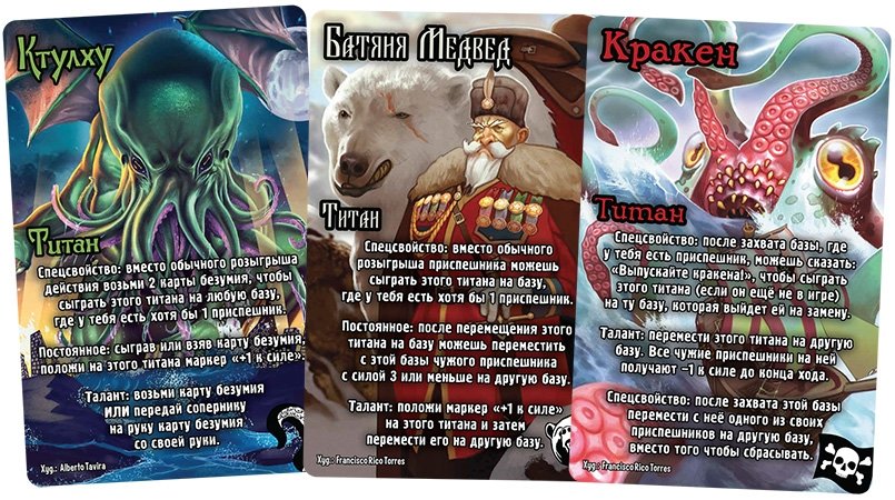 Сами по себе титаны принципиально отличаются от любых других карт в игре. В начале игры титаны лежат рядом со своими владельцами на столе – при этом они не могут попасть ни в руку, ни в колоду, ни в стопку сброса. Они для такого слишком круты.
