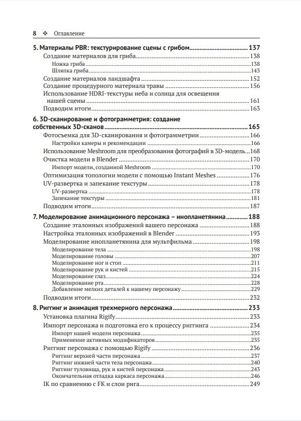 Эта книга посвящена рабочим процессам, связанным с визуальными эффектами (VFX), – таким как ноды геометрии, органическое моделирование, 3D-трекинг камеры, фотограмметрия, скульптинг, физические симуляции и композитинг. Вы узнаете, как использовать ноды геометрии для создания динамических сцен, а также выполнять 3D-сканирование объектов реального мира с помощью фотограмметрии. Выясните, как с нуля моделировать, оснащать кинематическими связями и анимировать своих собственных 3D-персонажей. Затем с помощью физических симуляций научитесь разбивать объект на части, использовать их для создания реалистичной одежды и шевелюры персонажа. Наконец, изучите настройки финального рендеринга и экспортируете свой шедевр 3D-анимации в виде последовательности кадров или видеофайла.