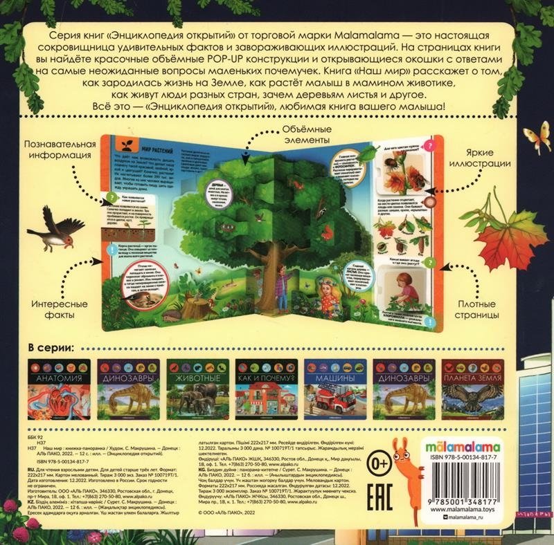 Энциклопедия открытий. Наш мир. Книги из серии «Энциклопедия открытий» — это настоящая сокровищница удивительных фактов и ответов на популярные вопросы маленьких почемучек. Книга «Наш мир» рассказывает читателю о происхождении жизни на Земле, о животном и растительном мире, о жилищах людей с разных уголков планеты. Объёмные POP-UP конструкции и красочные иллюстрации сделают изучение запоминающимся и лёгким.