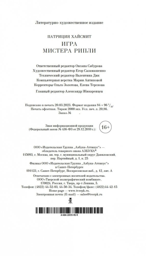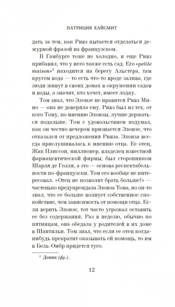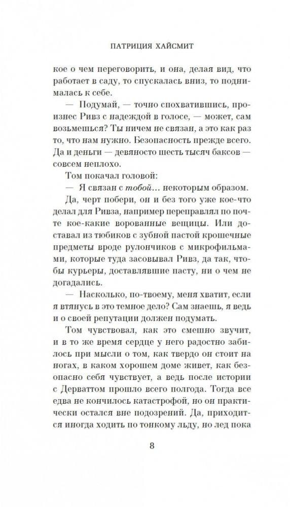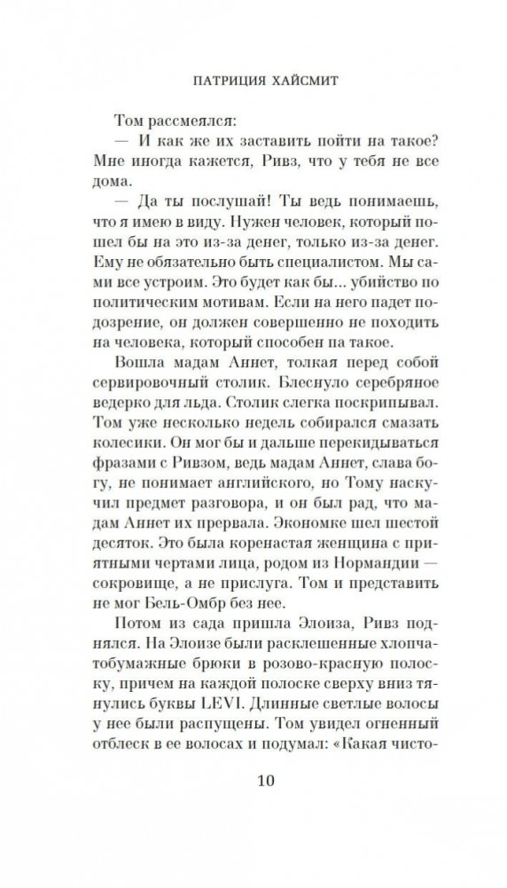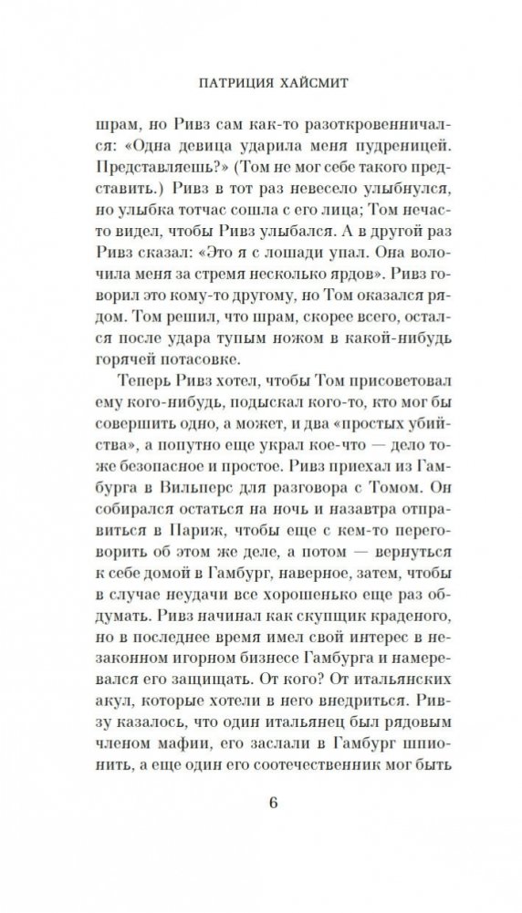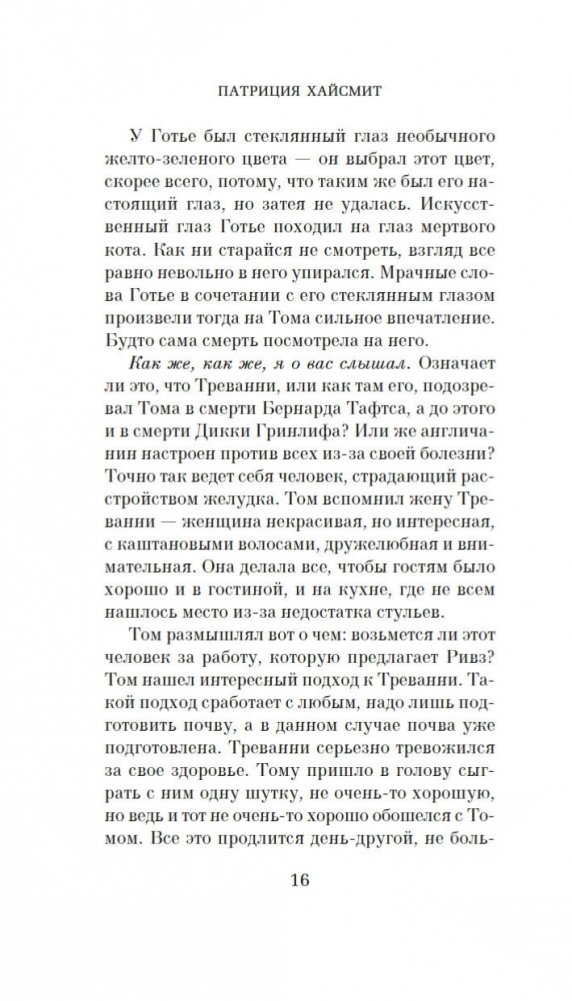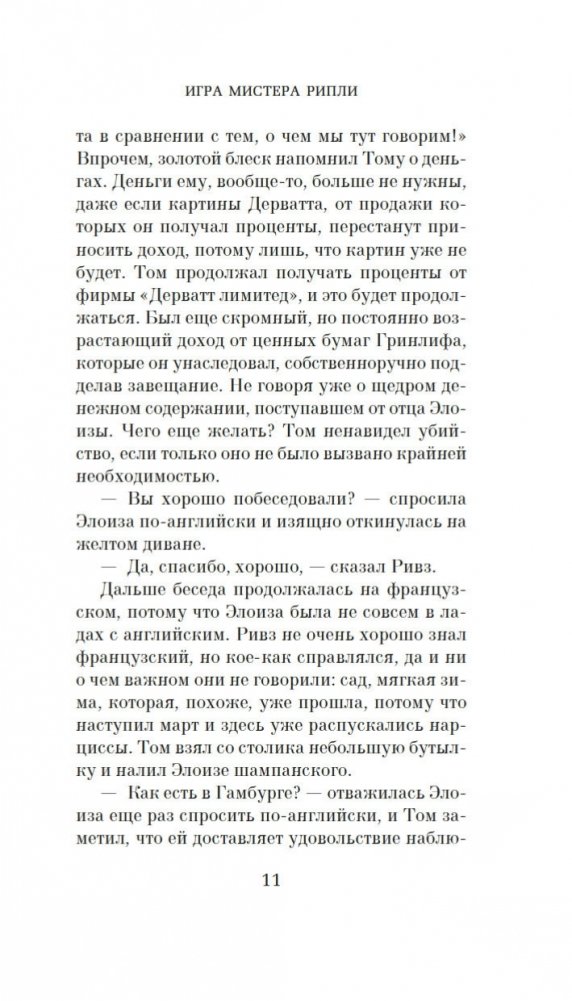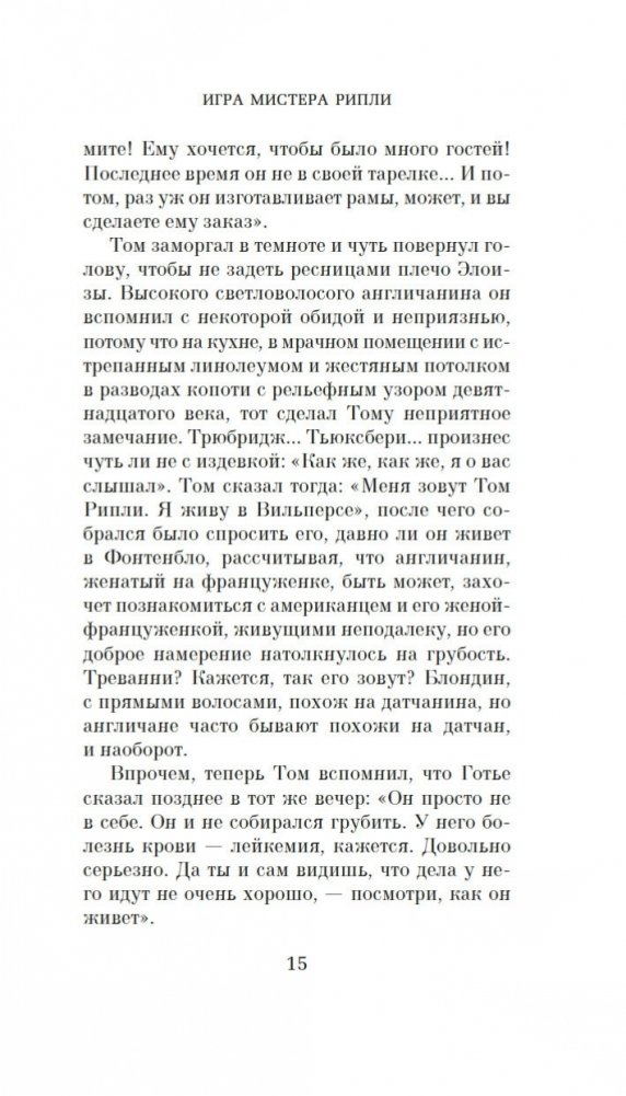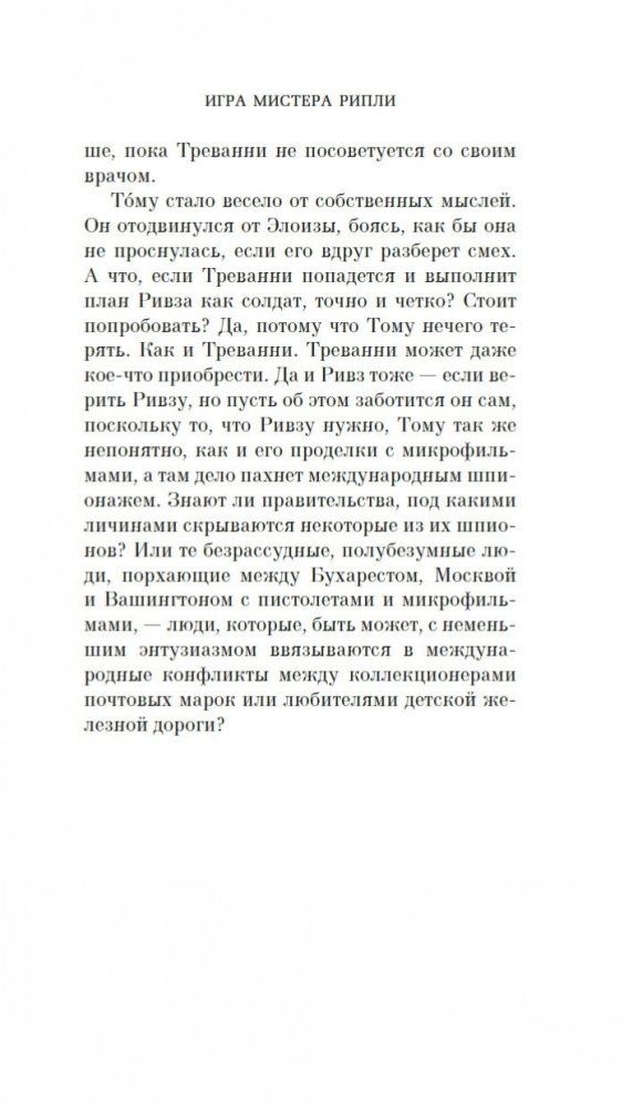 «Игра мистера Рипли» (1974) — третья книга в серии о самом известном персонаже американской романистки. Убийца «лишь по необходимости», гурман и эстет, любезный и вполне добродушный Рипли совсем не похож на банального костолома. Он обитает в мире, где вымысел и реальность неотличимы, границы между добром и злом весьма условны, а преступление — это игра, шахматная партия, невинное развлечение между игрой на клавесине и занятиями в саду; своего рода головоломка, только «головы» на кону всегда настоящие. Как и другие книги «риплиады», «Игра мистера Рипли» имела успех у читателей и была переведена на многие языки; по мотивам романа в 1977 году Вим Вендерсон снял фильм «Американский друг», в котором роль Рипли исполнил Деннис Хоппер, а в 2002 году вышел новый одноименный фильм с Джоном Малковичем в главной роли.