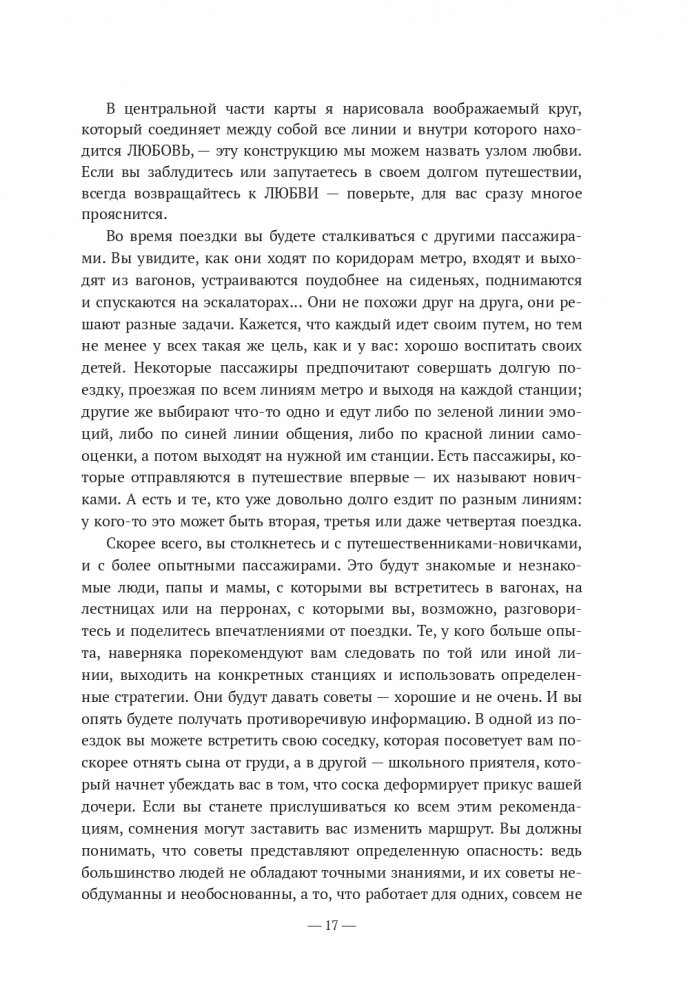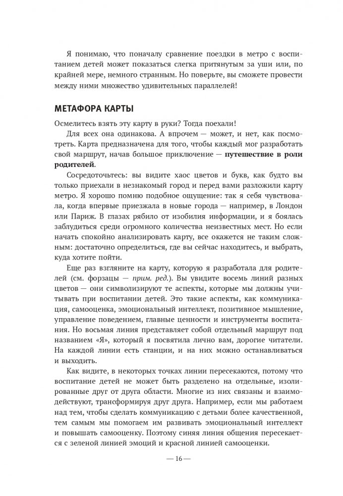 Мы отправляемся в большое путешествие с картой в руках. Она включает восемь линий разных цветов, соответствующих аспектам, которые мы должны учитывать при воспитании детей: коммуникация, самооценка, эмоции, позитивное мышление, поведение, ценности, инструменты, а также отдельный маршрут под названием «Я», который посвящен лично вам, дорогие родители. На каждой линии есть станции, где можно выйти.