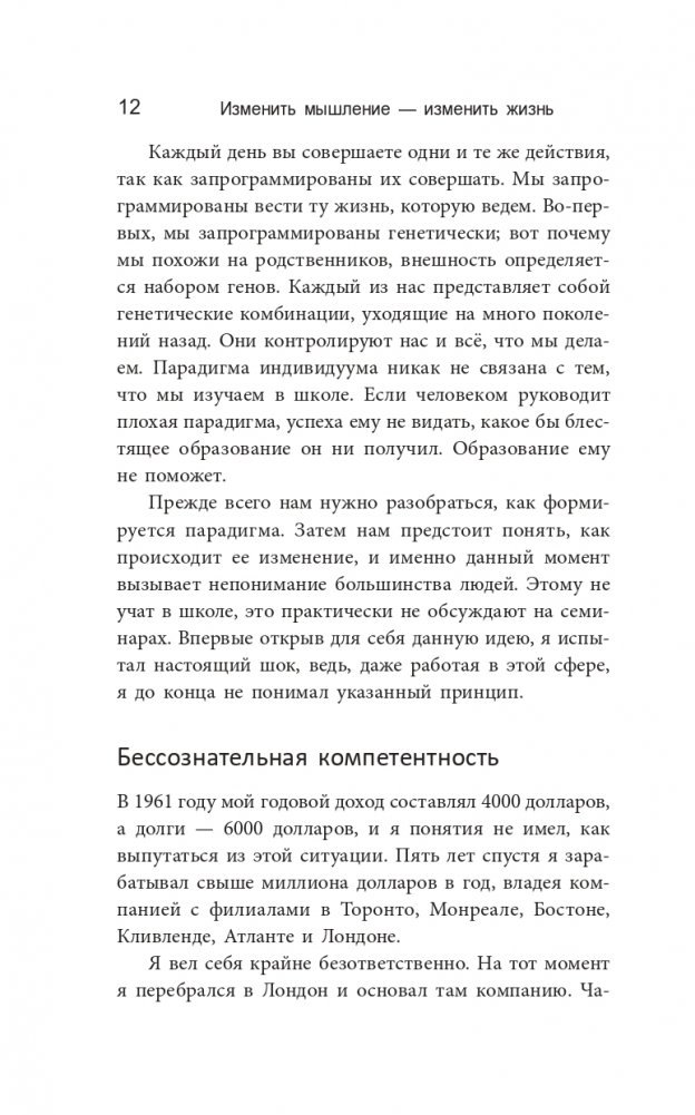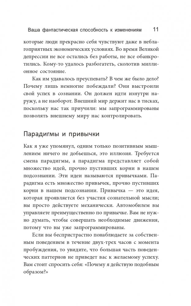 Когда вы приступаете к чему-то новому и непривычному, ваша ментальная программа (или парадигма) изо всех сил пытается вас остановить. Это может выражаться в виде самодовольства, страха, беспокойства, неуверенности, спешки и даже ненависти к себе — и в результате вы начинаете буксовать… Вы оказываетесь запертыми в рамках собственного мышления, а ваши мечты и амбиции так и остаются пустыми фантазиями.