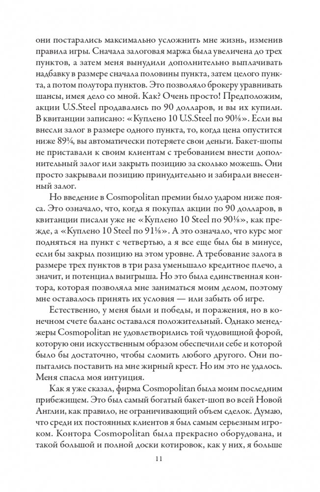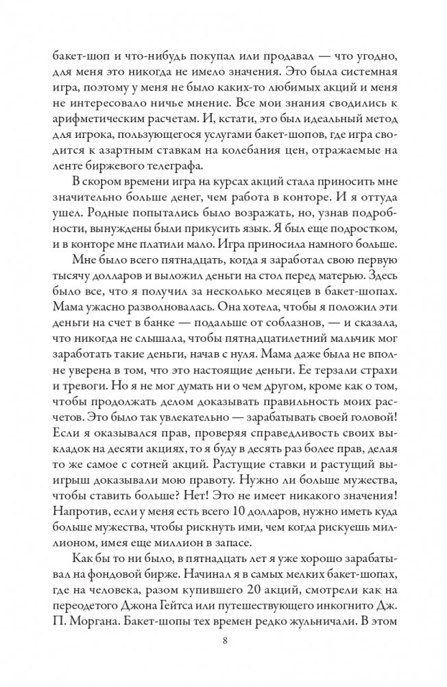 Это художественная биография, пожалуй, одного из самых величайших в истории финансовых гениев, Джесси Ливермора, рассказывающая всю правду о психологии рынков, инвестиций и биржевой игры. В своей книге Эдвин Лефевр описывает большое количество трейдовых стратегий, приемов и уловок, которые использовал легендарный мастер, делится бесценным опытом, полученным его героем, выдает множество интересных фактов из мира финансов и жизни знаменитого маклера. На этой классической книге, впервые изданной в 1923 году, выросло уже не одно поколение блестящих финансистов. Благодаря своему гениальному содержанию сегодня "Воспоминания биржевого спекулянта", как и век назад, остаются актуальным руководством для трейдеров.