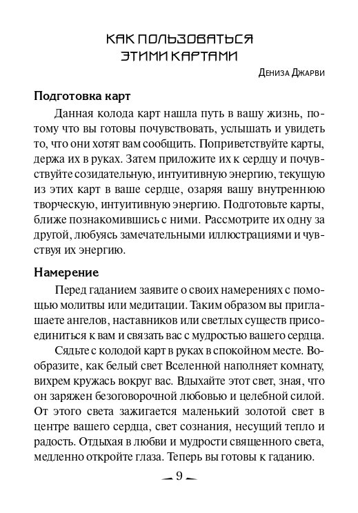 Эти карты помогут вам в решении многих насущных вопросов повседневной жизни. Благодаря удивительным посланиям свыше вы сможете подняться над проблемами и взглянуть на вещи с иной точки зрения, что позволит вам встать на путь великих перемен и трансформации собственного «я». А прилагаемая инструкция подробно расскажет, как делать и интерпретировать предсказания не только для вас, но и для ваших близких.