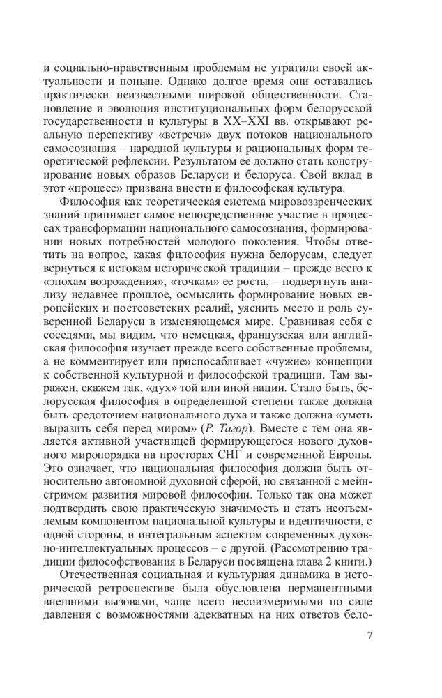 Рассматриваются основные этапы развития белорусской философской мысли, анализируются ее особенности в различные исторические эпохи, очерчиваются задачи и перспективы современной отечественной философии в развитии национального самосознания и формировании гражданско-патриотического мировоззрения молодого поколения. Через персоналии выдающихся мыслителей и деятелей культуры реконструируются гуманистическая и интеллектуальная традиции философии Беларуси. Практическая значимость философии как неотъемлемого компонента национальной культуры рассматривается в контексте синергийных процессов социокультурной динамики современного белорусского общества.