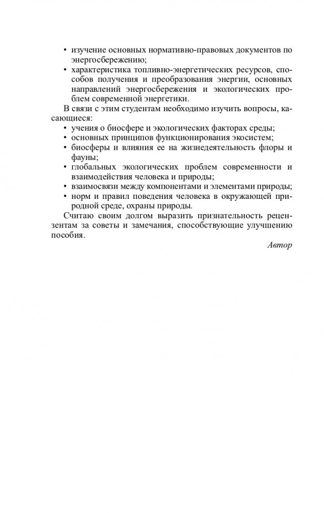 Раскрыты основные положения и концепции экологии и энергосбережения. Изложено учение о биосфере, экологических факторах, экологии популяций, био- и геосистемах. Освещено влияние атмосферы, литосферы, гидросферы, солнечной радиации, погоды и климата на жизнедеятельность флоры и фауны. Показаны особенности взаимодействия общества и природы. Рассматриваются основные проблемы энергосбережения и топливно-энергетических ресурсов, а также возобновляемые и альтернативные источники энергии.
