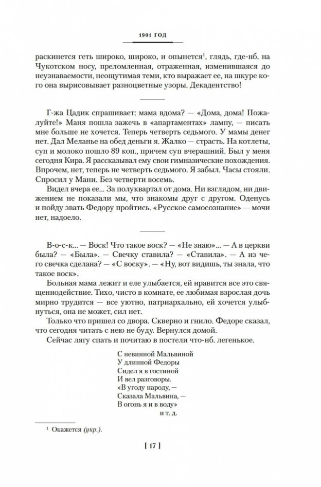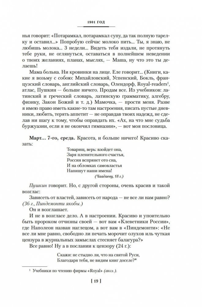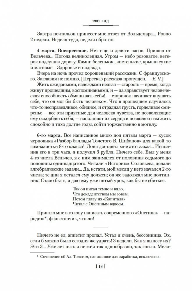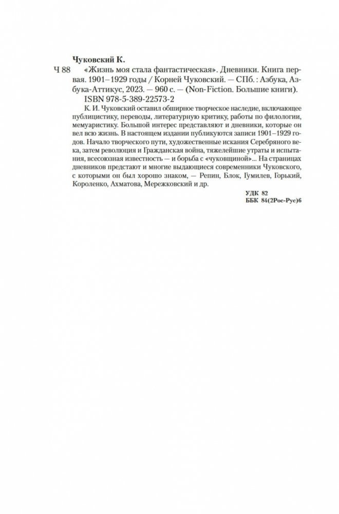К. И. Чуковский оставил обширное творческое наследие, включающее публицистику, переводы, литературную критику, работы по филологии, мемуаристику. Большой интерес представляют и дневники, которые он вел всю жизнь. В настоящем издании публикуются записи 1901–1929 годов. Начало творческого пути, художественные искания Серебряного века, затем революция и Гражданская война, тяжелейшие утраты и испытания, всесоюзная известность — и борьба с «чуковщиной»... На страницах дневников предстают и многие выдающиеся современники Чуковского, с которыми он был хорошо знаком, — Репин, Блок, Гумилев, Горький, Короленко, Ахматова, Мережковский и др.