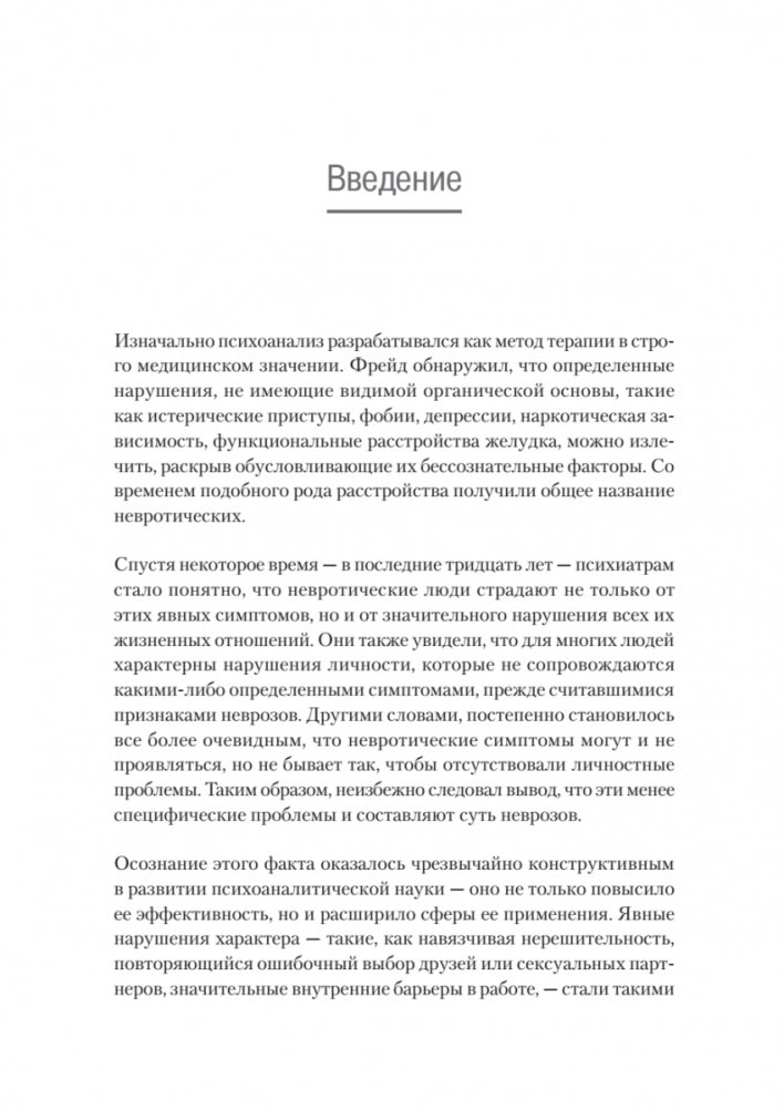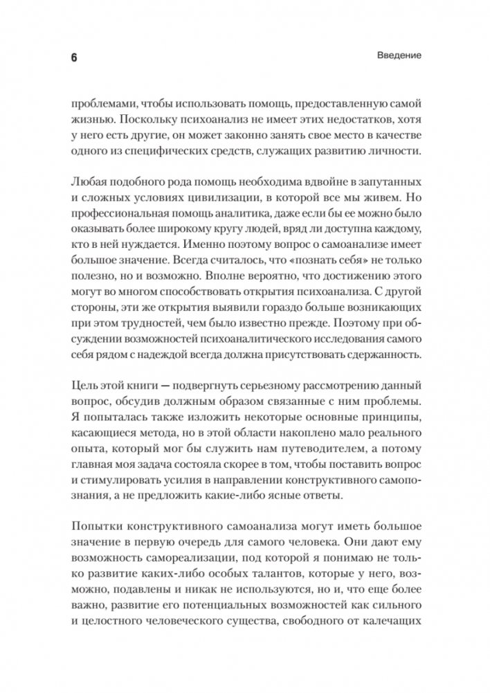 Одна из основных работ выдающегося ученого-психоаналитика Карен Хорни, яркой представительницы «неофрейдизма», бросившей вызов пессимизму и терапевтическому аскетизму великого австрийца. «Самоанализ» — своеобразная платформа теории самой Хорни — первое практическое руководство по психоанализу, помогающее людям преодолевать собственные проблемы. Во всех работах Хорни раскрывает типичные внутренние конфликты человека, а ее типология характеров — это мастерски выполненное описание людей, с которыми чуть не ежедневно сталкиваются не только психологи и психотерапевты, но и все мы. Книги Хорни, написаны легким, образным, ярким языком и понятны даже неспециалистам. Невероятно популярные в свое время, они и сегодня не утратили своей актуальности.