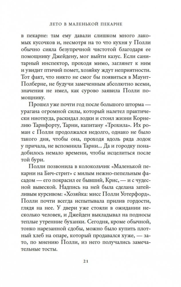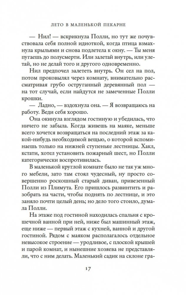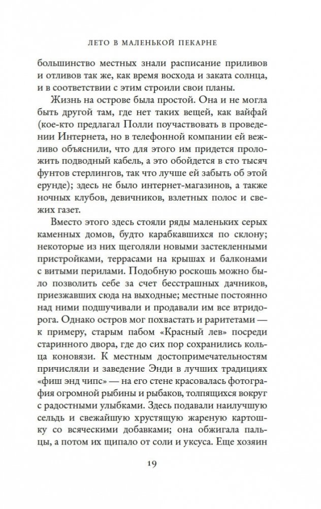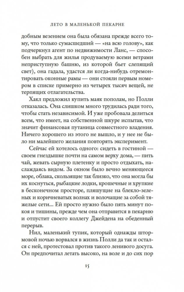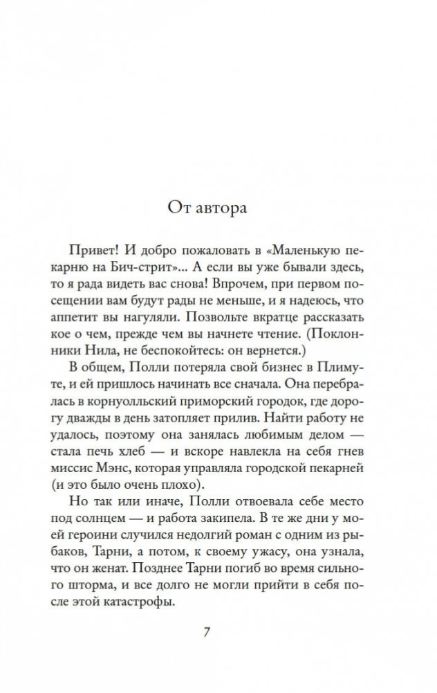 Как можно жить на краю, нет, за краем земли — на приливном островке, продуваемом всеми ветрами? Вдали от больших городов и привычных развлечений? Но такие робинзоны находятся — они приезжают сюда, навсегда влюбляются в Корнуолл и остаются, чтобы жить, работать и быть счастливыми. Одна из них — Полли Уотерфорд, быть может не избалованная везением, однако не зарывшая в землю свой талант: она умеет печь изумительно вкусный хлеб. У нее есть любимая работа, любимый человек и любимый домашний питомец (вообще-то, это морская птица), и все трое живут на маяке (другого жилья на острове не нашлось). Но как это часто бывает, идиллия не длится долго — в маленькой пекарне, где работает Полли, меняется владелец, и ей указывают на дверь. Ведь она совершенно не умеет экономить на качестве продуктов! Обитатели маяка переживают трудные времена и придумывают план спасения. Но чтобы его осуществить, придется расстаться — возможно, надолго. И вот, когда им наконец удается шаг за шагом приблизиться к цели, наступает очень славный, удачный, погожий день, не предвещающий ничего плохого... Плюс потрясающие рецепты от автора!
