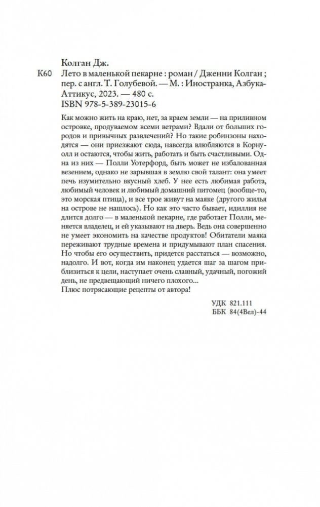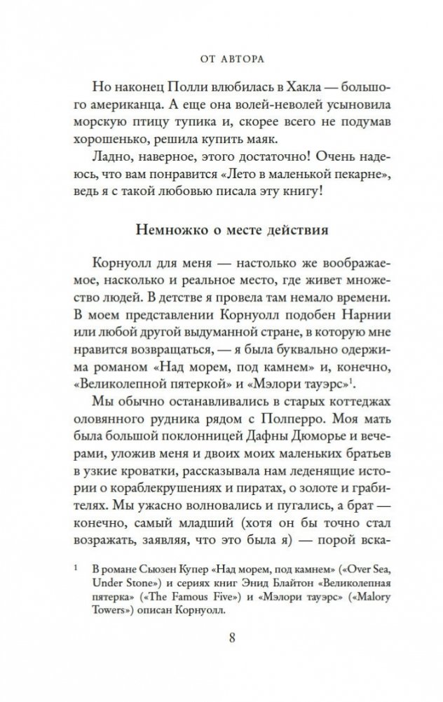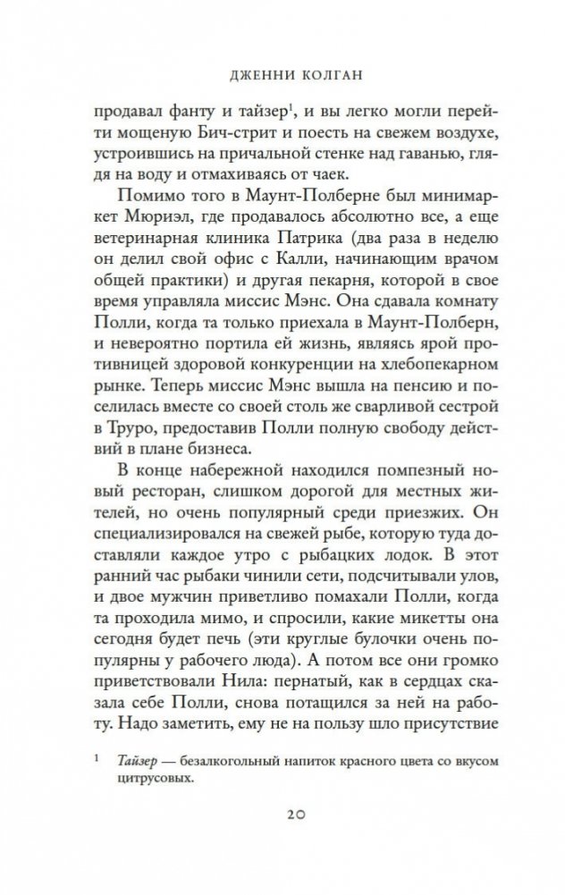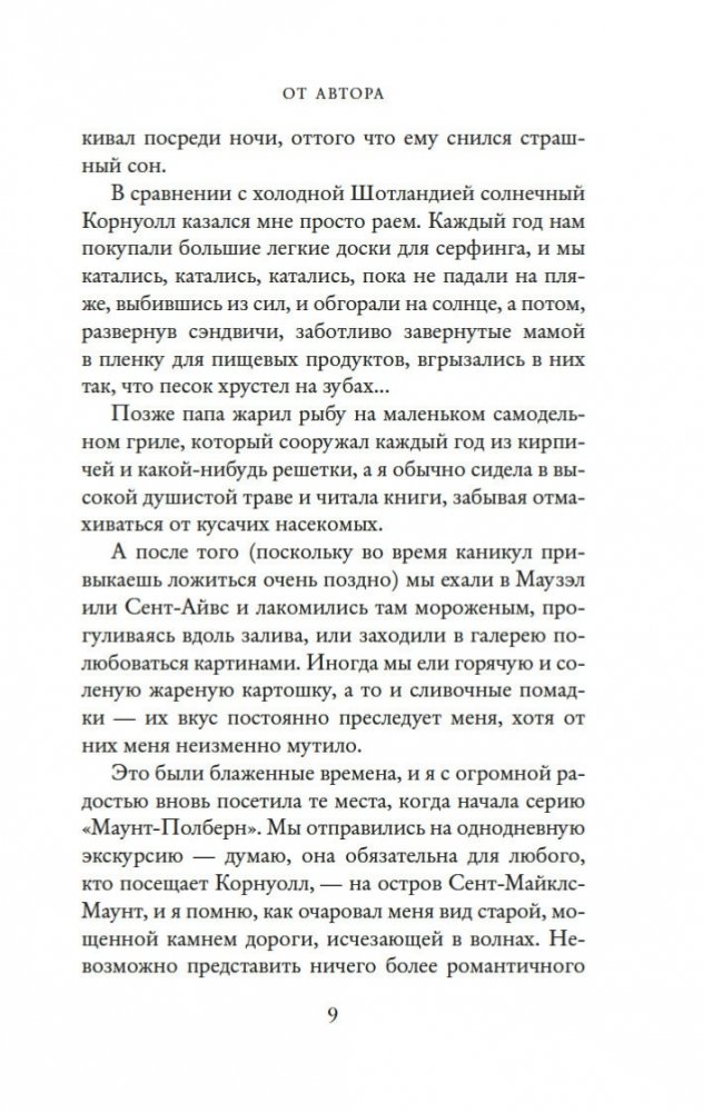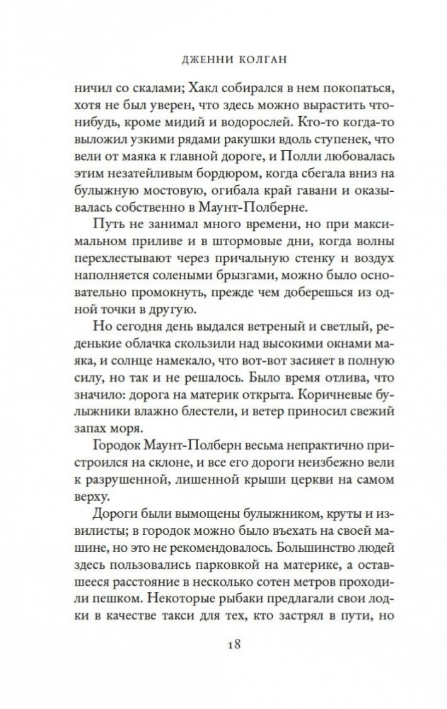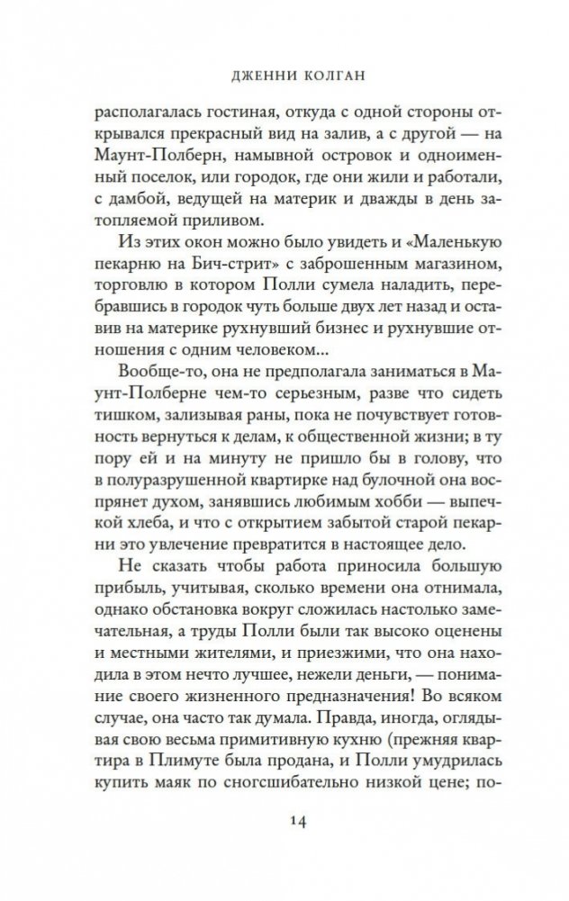 Как можно жить на краю, нет, за краем земли — на приливном островке, продуваемом всеми ветрами? Вдали от больших городов и привычных развлечений? Но такие робинзоны находятся — они приезжают сюда, навсегда влюбляются в Корнуолл и остаются, чтобы жить, работать и быть счастливыми. Одна из них — Полли Уотерфорд, быть может не избалованная везением, однако не зарывшая в землю свой талант: она умеет печь изумительно вкусный хлеб. У нее есть любимая работа, любимый человек и любимый домашний питомец (вообще-то, это морская птица), и все трое живут на маяке (другого жилья на острове не нашлось). Но как это часто бывает, идиллия не длится долго — в маленькой пекарне, где работает Полли, меняется владелец, и ей указывают на дверь. Ведь она совершенно не умеет экономить на качестве продуктов! Обитатели маяка переживают трудные времена и придумывают план спасения. Но чтобы его осуществить, придется расстаться — возможно, надолго. И вот, когда им наконец удается шаг за шагом приблизиться к цели, наступает очень славный, удачный, погожий день, не предвещающий ничего плохого... Плюс потрясающие рецепты от автора!