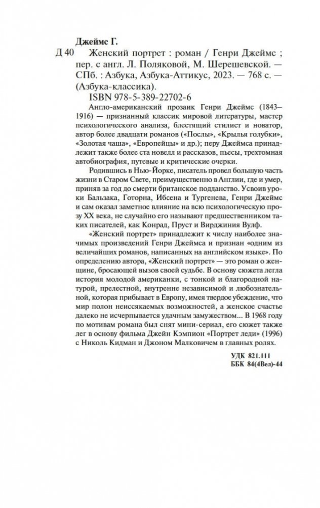 Англо-американский прозаик Генри Джеймс (1843–1916) — признанный классик мировой литературы, мастер психологического анализа, блестящий стилист и новатор, автор более двадцати романов («Послы», «Крылья голубки», «Золотая чаша», «Европейцы» и др.); перу Джеймса принадлежит также более ста новелл и рассказов, пьесы, трехтомная автобиография, путевые и критические очерки. Родившись в Нью-Йорке, писатель провел большую часть жизни в Старом Свете, преимущественно в Англии, где и умер, приняв за год до смерти британское подданство. Усвоив уроки Бальзака, Готорна, Ибсена и Тургенева, Генри Джеймс и сам оказал заметное влияние на всю психологическую прозу XX века, не случайно его называют предшественником таких писателей, как Конрад, Пруст и Вирджиния Вулф. «Женский портрет» принадлежит к числу наиболее значимых произведений Генри Джеймса и признан «одним из величайших романов, написанных на английском языке». По определению автора, «Женский портрет» — это роман о женщине, бросающей вызов своей судьбе. В основу сюжета легла история молодой американки, с тонкой и благородной натурой, прелестной, внутренне независимой и любознательной, которая прибывает в Европу, имея твердое убеждение, что мир полон неиссякаемых возможностей, а женское счастье далеко не исчерпывается удачным замужеством… В 1968 году по мотивам романа был снят мини-сериал, его сюжет также лег в основу фильма Джейн Кэмпион «Портрет леди» (1996) с Николь Кидман и Джоном Малковичем в главных ролях.