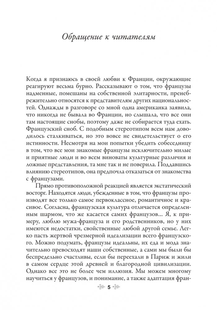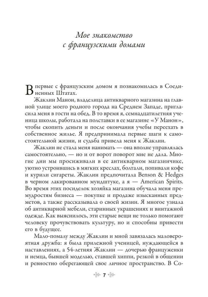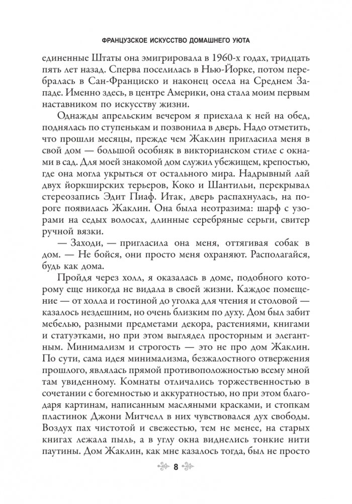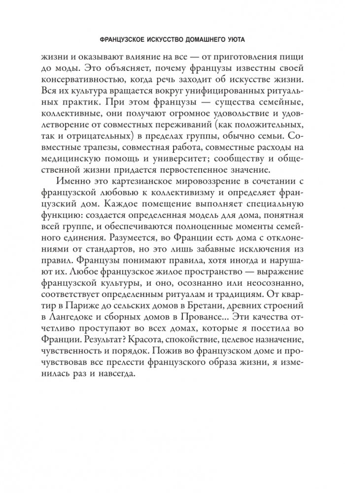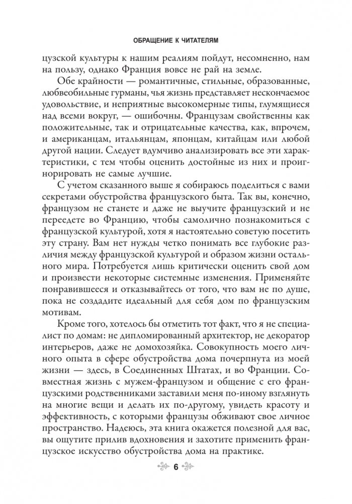 В книге даются подробные рекомендации, как обустроить прихожую или создать собственную гостиную (salon) во французском духе, чем наполнить помещение, как расположить мебель, каких ритуалов придерживаться, приглашая в дом гостей.