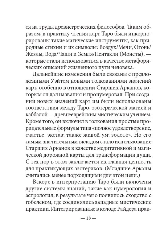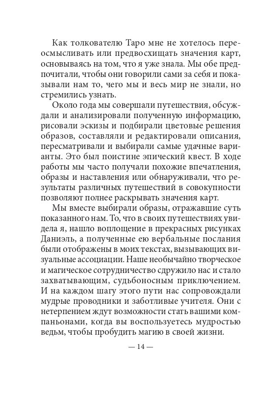 Младшие Арканы в этой колоде характеризуют роль стихий Воздуха, Огня, Воды и Земли в повседневной жизни. Воодушевляющие послания карт призывают вас использовать необузданную божественную магию природы, следуя мудрым посланиям матери-земли и ее детей. Старшие Арканы — это карты судьбы, которые описывают путешествие души в направлении, противоположном традиционному. Чтобы достичь просветления, вовсе не обязательно оставлять позади все заботы материального мира. С точки зрения ведьм, для этого нужно лишь проникнуть вглубь матери-земли и своей истинной сущности, где воплощается божественная энергия.