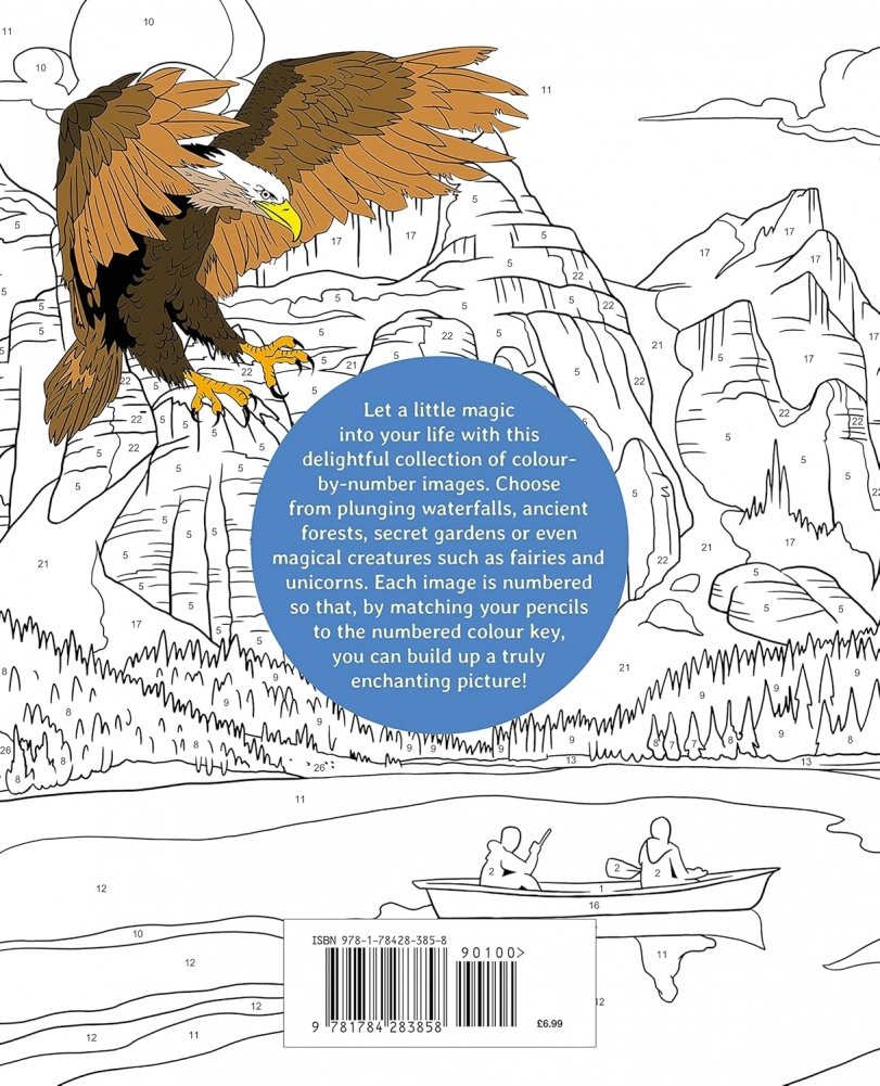 Let a little magic into your life with this delightful collection of colour by number images. Choose from plunging waterfalls, ancient forests, secret gardens or even magical creatures such as fairies and unicorns. Each image is numbered so that, by matching your pencils to the numbered colour key, you can build up a truly enchanting picture!Colouring by numbers has opened up a world of creativity for millions of people. With a little patience and care, you can hone your colouring skills to create great-looking images.The numbers in the images correspond to the numbered colour key on the inside of this flap. Spend some time matching your set of coloured pencils to the colours in the key - you can even label each pencil with a number to make things easier. You will find fully coloured versions of all the images inside the cover.