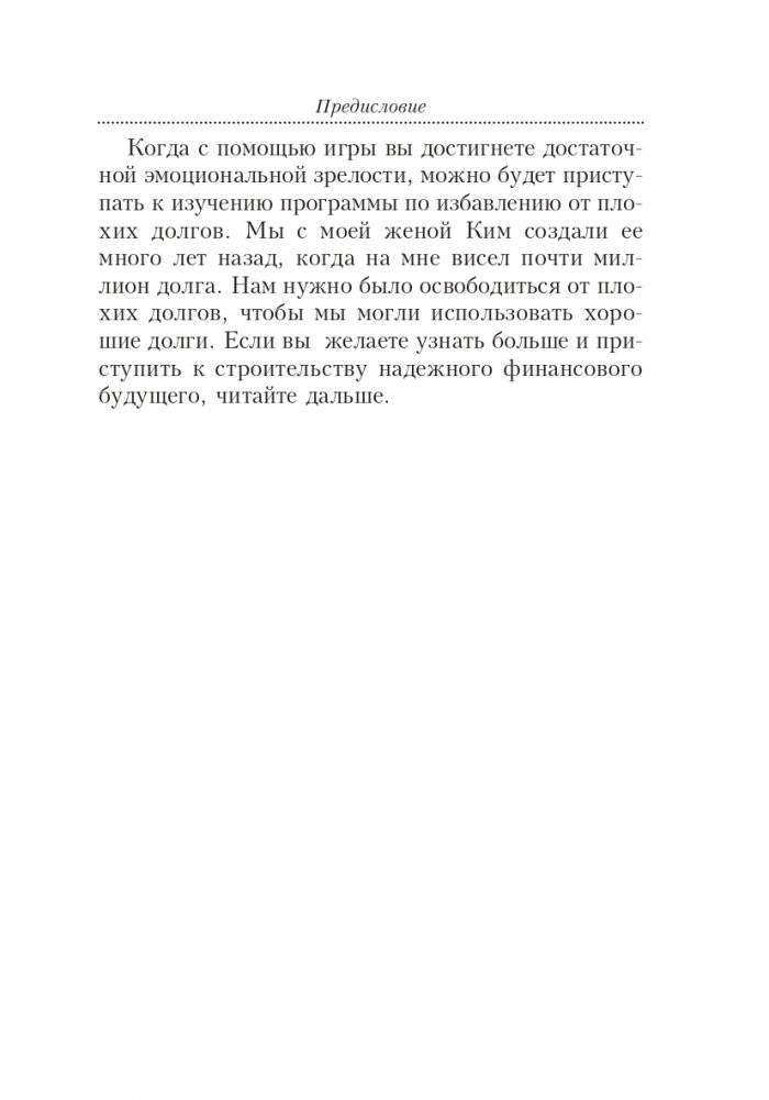 Нас приучили относиться к долгам как к злу, но это не всегда правильно, особенно если у вас есть финансовые знания, которые помогают разобраться, приносит долг пользу или вред. В этой книге вы найдете стратегии, которые помогут вам выбраться из плохих долгов и избегать их в дальнейшем, а также в своих интересах пользоваться хорошими долгами. Роберт Кийосаки снабдит вас всеми необходимыми знаниями, чтобы вы могли заставить свои деньги работать на себя. Это книга для всех, кто готов повысить свой финансовый IQ и научиться получать выгоду даже от долгов.