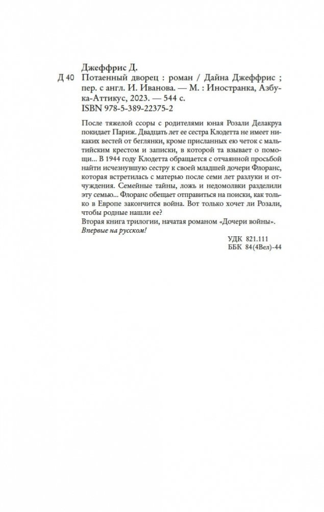 После тяжелой ссоры с родителями юная Розали Делакруа покидает Париж. Двадцать лет ее сестра Клодетта не имеет никаких вестей от беглянки, кроме присланных ею четок с мальтийским крестом и записки, в которой та взывает о помощи... В 1944 году Клодетта обращается с отчаянной просьбой найти исчезнувшую сестру к своей младшей дочери Флоранс, которая встретилась с матерью после семи лет разлуки и отчуждения. Семейные тайны, ложь и недомолвки разделили эту семью... Флоранс обещает отправиться на поиски, как только в Европе закончится война. Вот только хочет ли Розали, чтобы родные нашли ее? Вторая книга трилогии, начатая романом «Дочери войны». Впервые на русском!