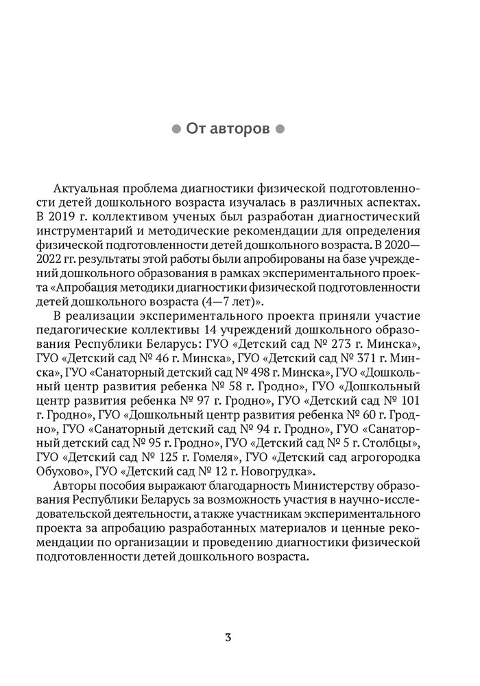 Пособие включает методические рекомендации по диагностике физической подготовленности детей дошкольного возраста. Материал пособия успешно апробирован в рамках экспериментального проекта при участии 14 учреждений дошкольного образования Республики Беларусь.