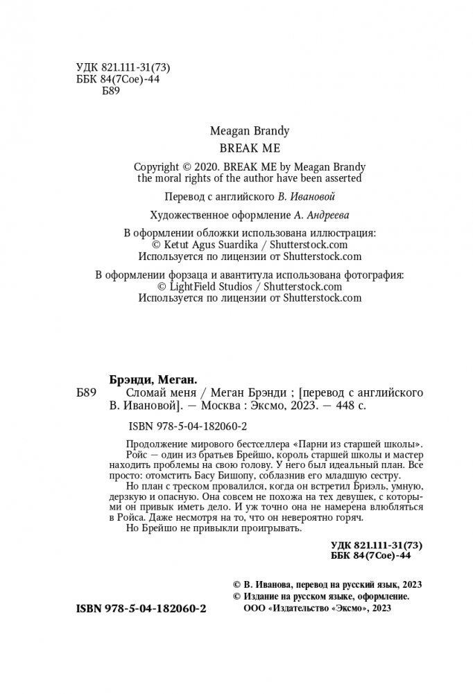 «Сломай меня» — заключительная книга в серии о братьях Брейшо. История Мэддока и Рэйвен закончена, но приключения братьев продолжаются! Героями пятой части станут Ройс и Бриэль.