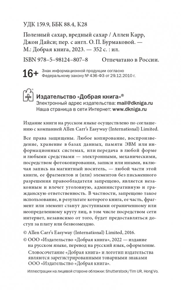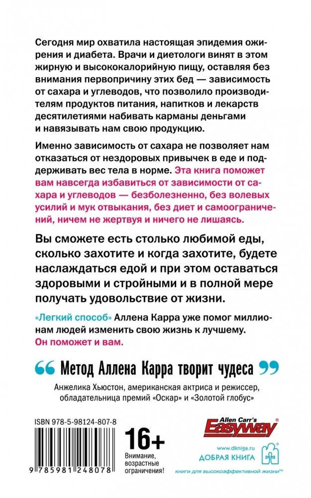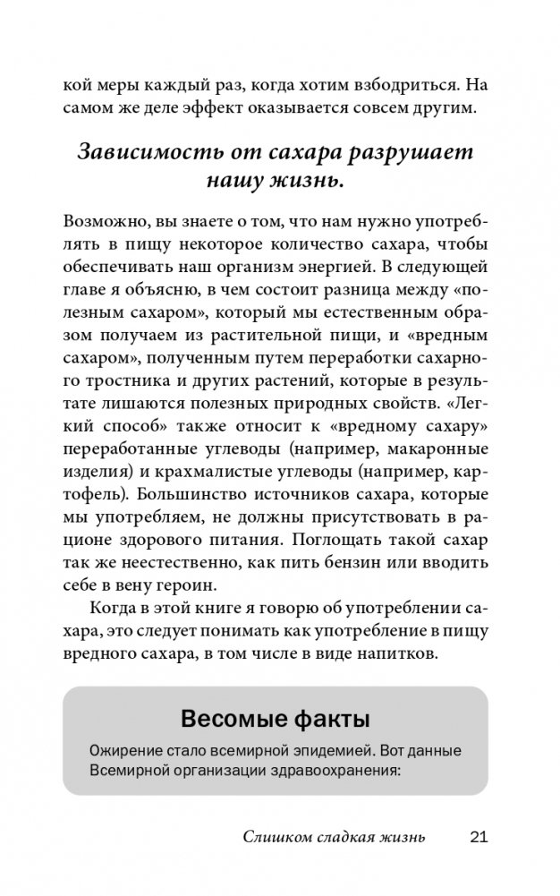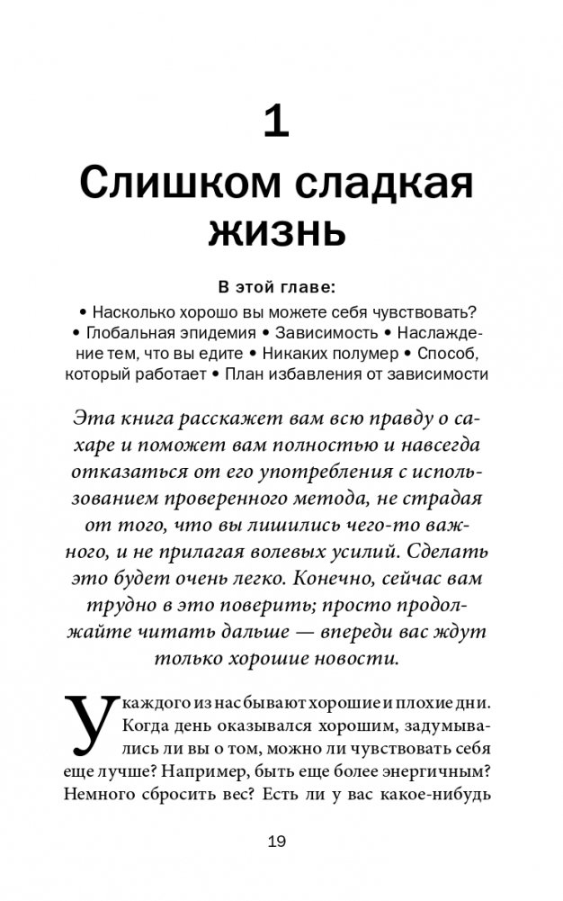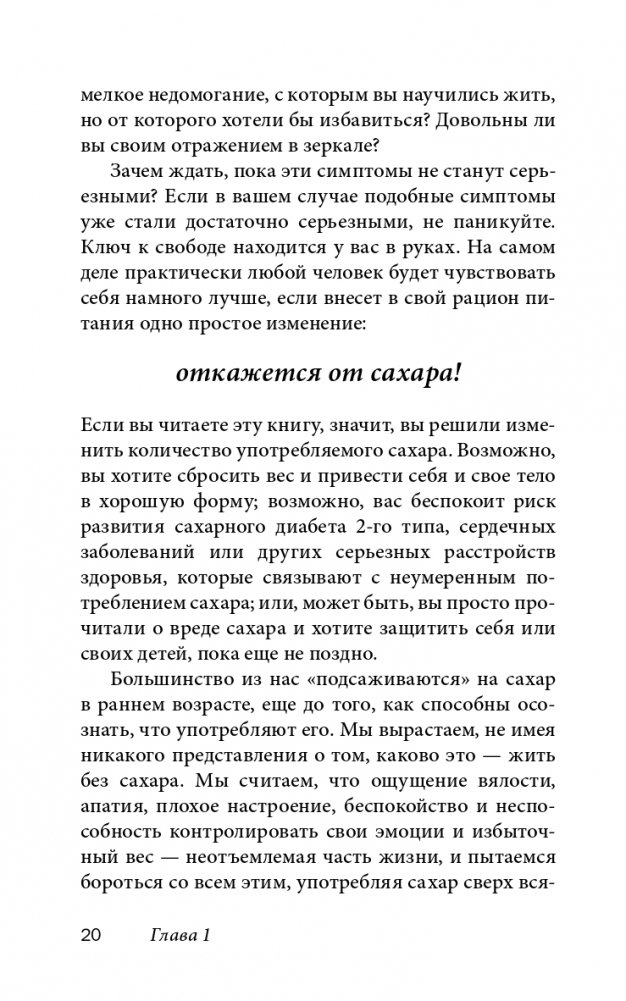 Именно зависимость от сахара, которая формируется у нас в первые годы жизни, не позволяет нам отказаться от нездоровых привычек в еде и поддерживать вес тела в норме. Эта книга поможет вам навсегда избавиться от такой зависимости — безболезненно, без волевых усилий и мук отвыкания, без диет и самоограничений, ничем не жертвуя и ничего не лишаясь. Вы сможете есть столько любимой еды, сколько захотите и когда захотите, будете наслаждаться едой и при этом оставаться здоровыми и стройными и в полной мере получать удовольствие от жизни.