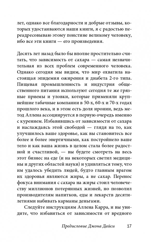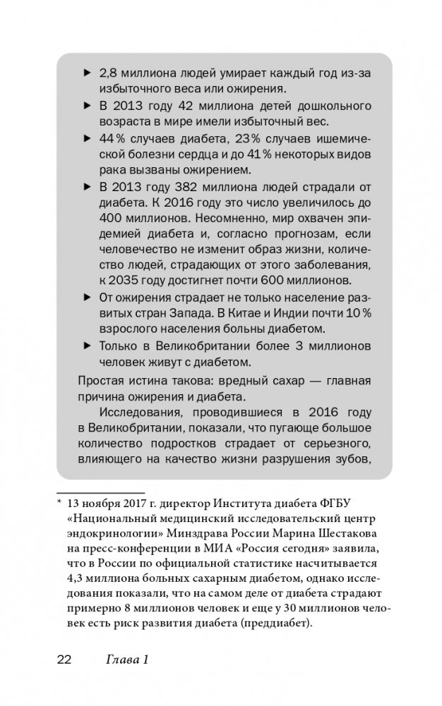 Сегодня мир охватила настоящая эпидемия ожирения и диабета 2-го типа. Современная медицина винит в этом жирную и высококалорийную пищу, оставляя без внимания первопричину всех этих бед — зависимость от сахара и так называемых «пустых» углеводов. Перенос фокуса внимания с сахара на жиры стоил человечеству миллионов потерянных жизней и позволил производителям продуктов питания, напитков и лекарств десятилетиями набивать карманы деньгами и навязывать нам свою продукцию, используя самые грязные приемы табачной индустрии.