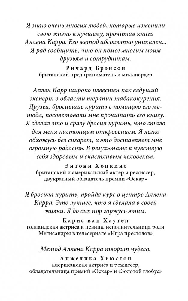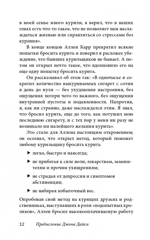 «Легкий способ» Аллена Карра стал самым успешным методом избавления от никотиновой зависимости и теперь широко используется для исцеления самых разных расстройств и зависимостей, от алкоголизма и наркомании до игромании и аэрофобии. Этот метод уже помог миллионам людей изменить свою жизнь к лучшему. Он поможет и вам.