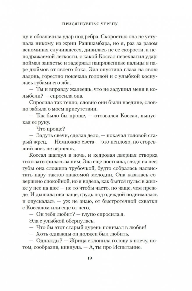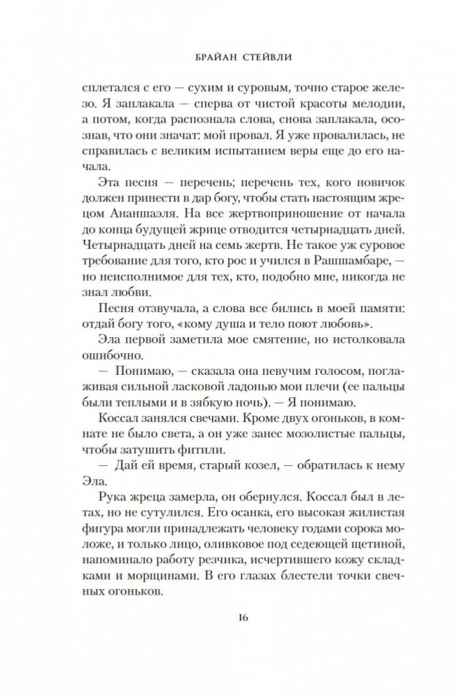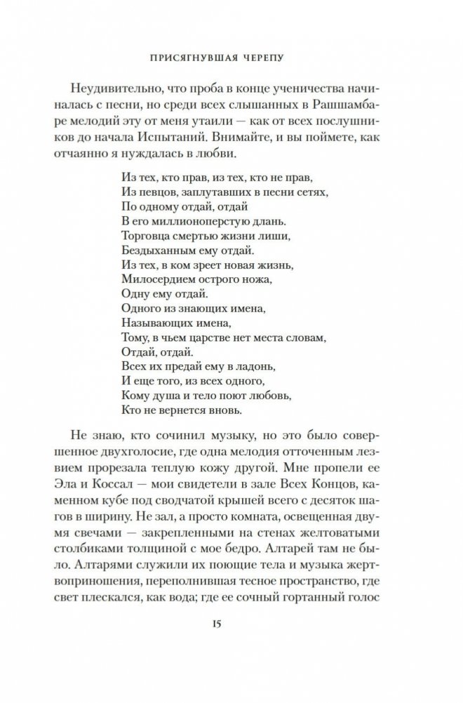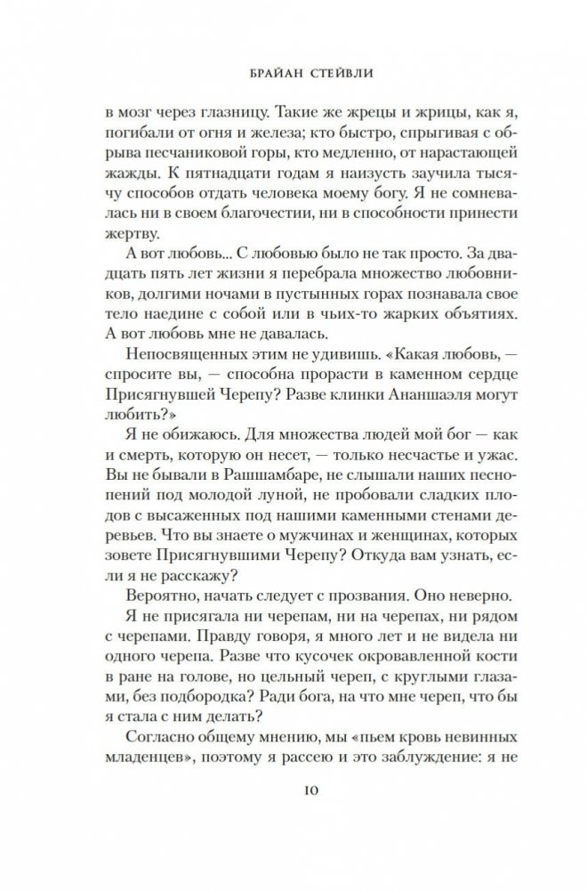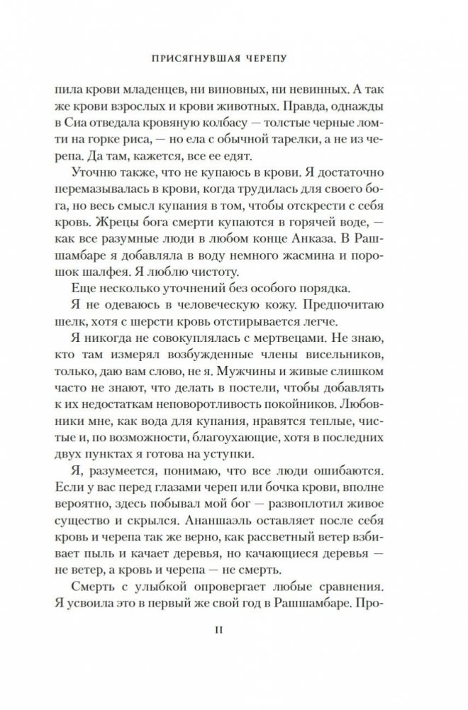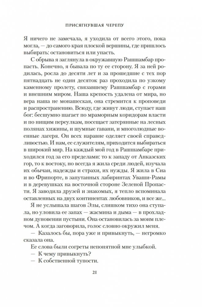 Ей не нравится, когда ее называют Присягнувшая Черепу. Это не передает и доли ее преданности Ананшаэлю, богу смерти. Она мечтает стать его жрицей, и теперь ей осталось пройти последнее испытание. У нее будет четырнадцать дней на то, чтобы убить семерых, описанных в древней ритуальной песне, включая того, кто заставит ее душу и тело петь от любви. Пирр — воплощенная смертоносная сила и с легкостью принесет в жертву божеству человеческую жизнь, а если придется, отдаст и собственную. Она никогда ни с кем себя не связывала. Лишь однажды ей довелось встретить человека, которого она... запомнила. Он подавил мятеж в Домбанге — тысячелетнем городе, что стоит над болотом, кишащим злобными тварями. Пирр вместе с двумя свидетелями отправляется туда, чтобы среди темных извилистых каналов найти этого человека и покончить с ним... Роман из вселенной «Хроник Нетесаного трона». Впервые на русском!
