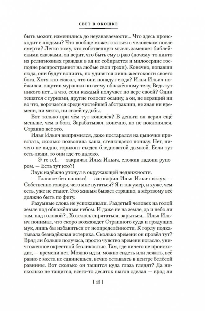 Писатель Святослав Логинов — заслуженный лауреат многих фантастических премий («Странник», «Интерпресскон», «Роскон», премии «Аэлита», Беляевской премии, премии Кира Булычёва, Ивана Ефремова и т. д.), мастер короткой формы, автор романа «Многорукий бог далайна», одного из самых необычных явлений в отечественной фантастике, перевернувшего представление о том, какой она должна быть, и других ярких произведений, признанных и востребованных читателями. Три романа, вошедших в данную книгу, — это три мира, три стороны жизни. В романе «Свет в окошке» действие происходит по ту сторону бытия, в загробном мире, куда после смерти попадает главный герой. Но этот загробный мир не зыбок и эфемерен, как в представлении большинства мистиков. В нём жёсткие экономические законы: здесь можно получить всё, что вам необходимо по жизни, — от самых простых вещей, одежды, услуг, еды до роскоши богатых особняков, обнесённых неприступными стенами, — но расплачиваться за ваши потребности нужно памятью, которую вы оставили по себе в мире живых. Пока о вас помнят там, здесь вы тоже живой. Если память о вас стирается, вы превращаетесь в пустоту. Роман «Земные пути» — многослойный рассказ о том, как из мира уходит магия. Прогресс, бог-трудяга, покровитель мастеровых и учёных, вытеснил привычных богов, в которых верили люди, а вместе с ними и магию на глухие задворки цивилизации. В мире, который не верит в магию, магия утрачивает силу. В мире, который не верит в богов, боги перестают быть богами. «Колодезь». Время действия XVII век. Место действия — половина мира. Куда только ни бросала злая судьба Семёна, простого крестьянина из-под Тулы, подавшегося пытать счастье на Волгу и пленённого степняками-кочевниками. Пески Аравии, Персия, Мекка, Стамбул, Иерусалим, Китай, Индия… В жизни он прошёл через всё, принял на себя все грехи, менял знамёна, одежды, веру и на родину вернулся с душой, сожжённой ненавистью к своим обидчикам. Но в природе есть волшебный колодезь, дарующий человеку то, что не купишь ни за какие сокровища. Это дар милосердия. И принимающий этот дар обретает в сердце успокоение...