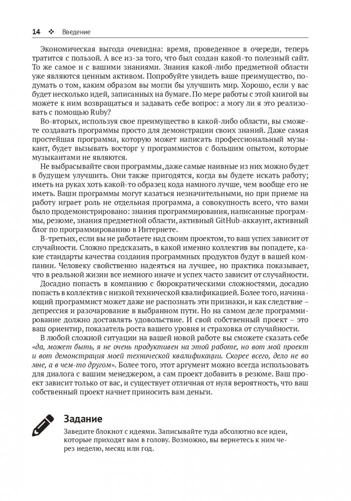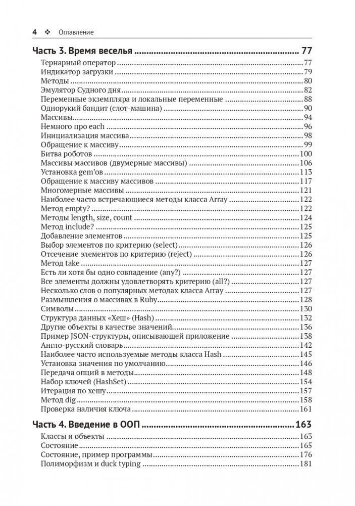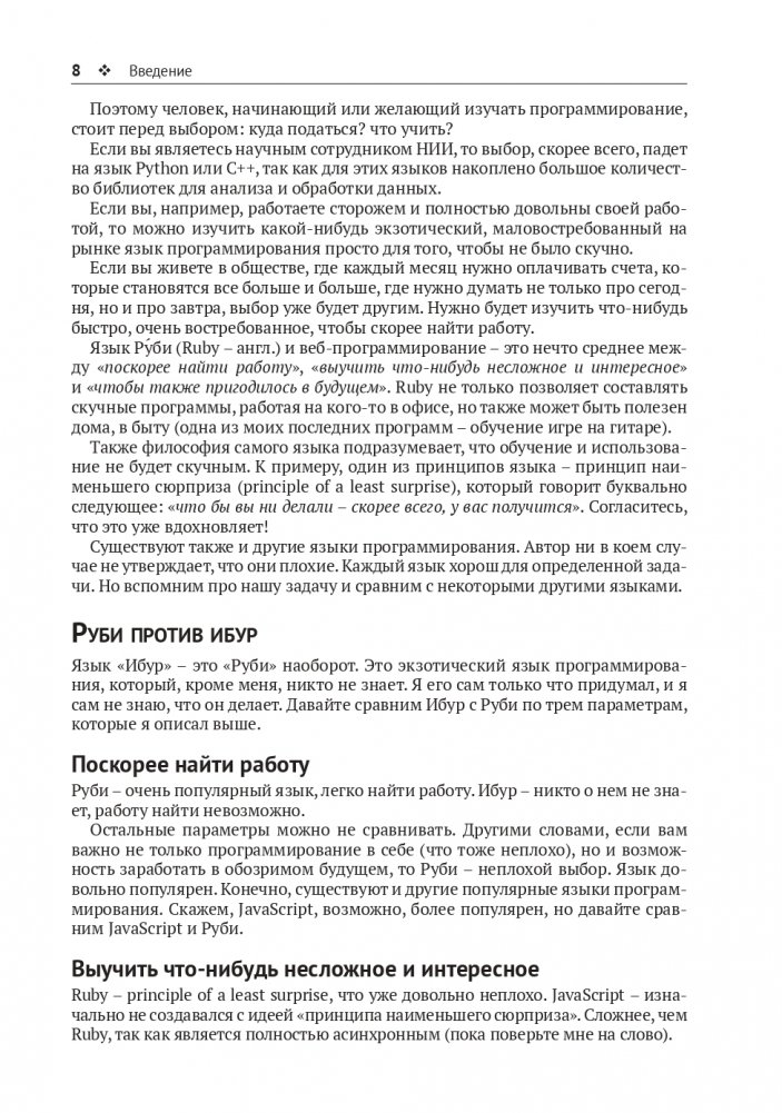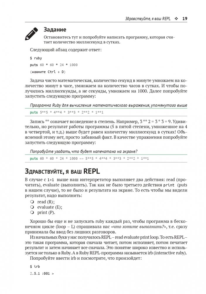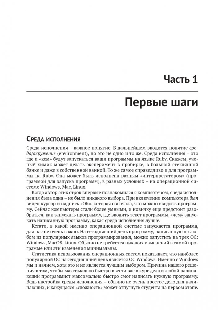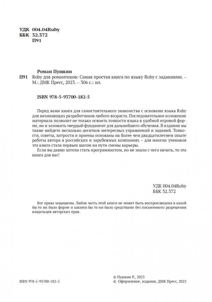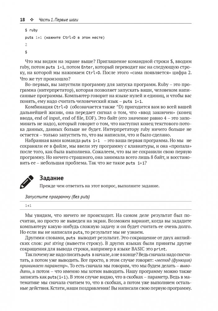 Перед вами книга для самостоятельного знакомства с основами языка Ruby для начинающих разработчиков любого возраста. Последовательное изложение материала позволит не только освоить тонкости языка в удобной игровой форме, но и заложить твердый фундамент для дальнейшего обучения. Многочисленные советы, хитрости и приемы основаны на более чем двадцатилетнем опыте работы автора в российских и зарубежных компаниях - для многих учеников эта книга стала первым шагом на пути смены карьеры. Упражнения и задания, а также многочисленные иллюстрации помогут во всех тонкостях освоить материал.