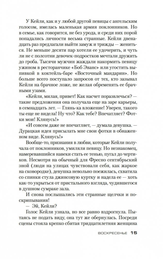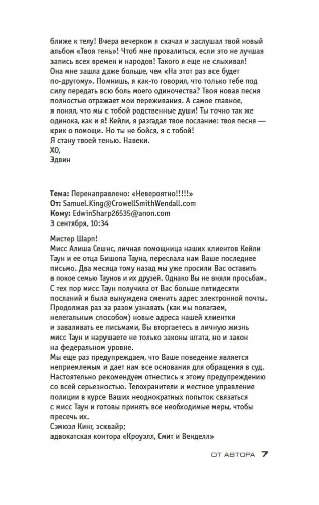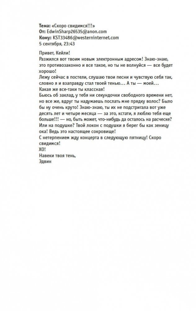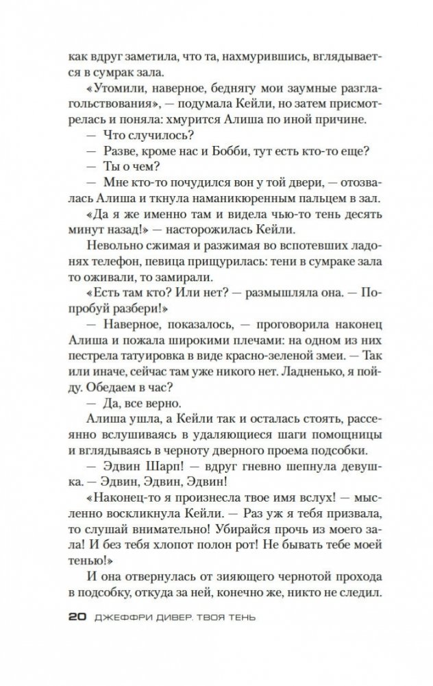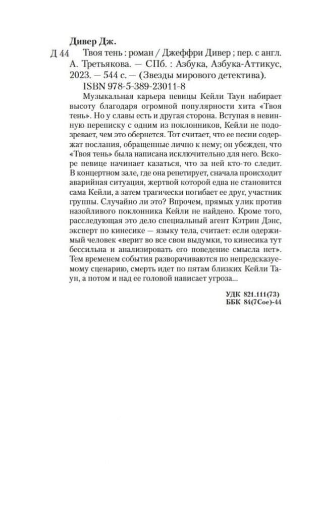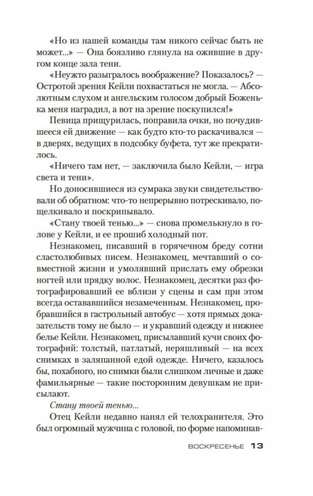 Музыкальная карьера певицы Кейли Таун набирает высоту благодаря огромной популярности хита «Твоя тень». Но у славы есть и другая сторона. Вступая в невинную переписку с одним из поклонников, Кейли не подозревает, чем это обернется. Тот считает, что ее песни содержат послания, обращенные лично к нему; он убежден, что «Твоя тень» была написана исключительно для него. Вскоре певице начинает казаться, что за ней кто-то следит. В концертном зале, где она репетирует, сначала происходит аварийная ситуация, жертвой которой едва не становится сама Кейли, а затем трагически погибает ее друг, участник группы. Случайно ли это? Впрочем, прямых улик против назойливого поклонника Кейли не найдено. Кроме того, расследующая это дело специальный агент Кэтрин Дэнс, эксперт по кинесике — языку тела, считает: если одержимый человек «верит во все свои выдумки, то кинесика тут бессильна и анализировать его поведение смысла нет». Тем временем события разворачиваются по непредсказуемому сценарию, смерть идет по пятам близких Кейли Таун, а потом и над ее головой нависает угроза...