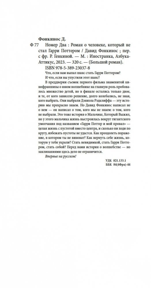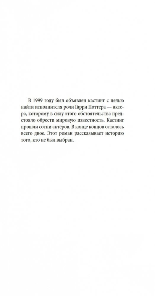 Что, если вам выпал шанс стать Гарри Поттером? И что, если вы упустили этот шанс? В преддверии съемок первого фильма знаменитой кинофраншизы о юном волшебнике на главную роль пробовалось множество детей, но в финале остались только двое, и те, от кого зависело решение, долго колебались, не зная, кого выбрать. Они выбрали Дэниэла Рэдклиффа — эту историю мы прекрасно знаем. Но Давид Фонкинос написал не о нем — он написал о том, кого мы не знаем: о том, кого не выбрали. Это тоже история о Мальчике, Который Выжил, но у этого мальчика жизнь выстроилась вокруг гигантского умолчания под названием «Гарри Поттер и мой провал» — целая жизнь с пустотой вместо центра, и сколько ни ходи по кругу, избежать пустоты не удастся. Как преодолеть поражение, в котором ты не виноват? Как вернуть себе жизнь, которую у тебя украли? Стать невидимкой, стать Гарри Поттером, стать собой? Перед вами история о волшебстве — но заклинаниями здесь дело не ограничится. Впервые на русском!