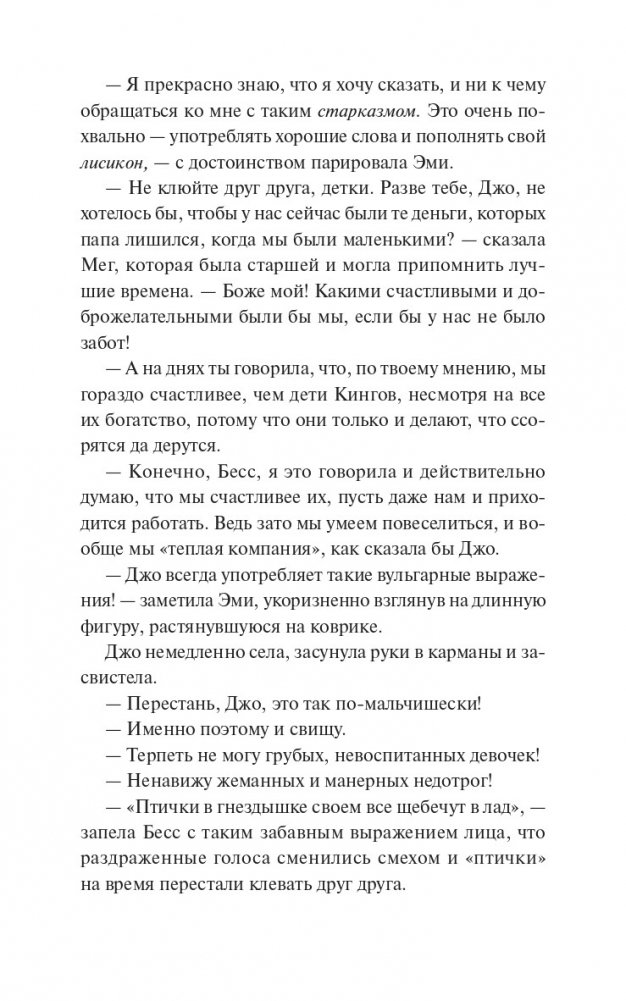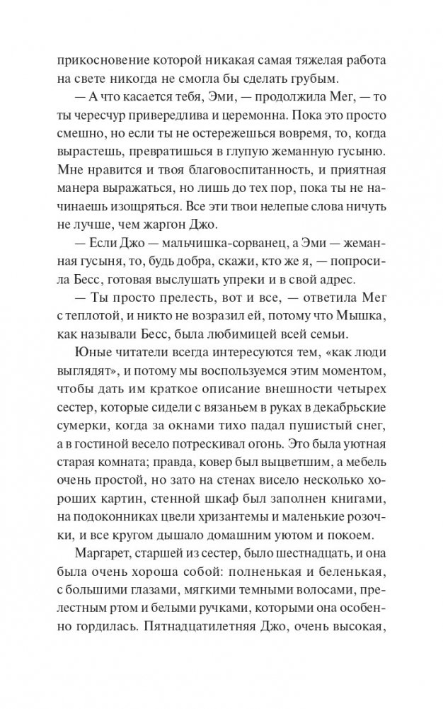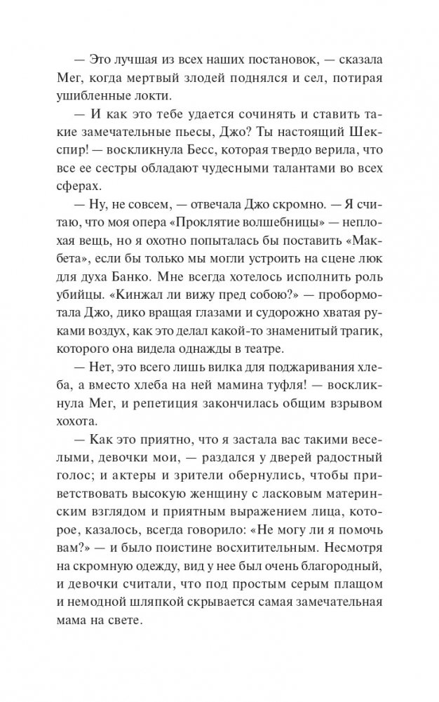 "Маленькие женщины" — ставший классическим роман американской писательницы Луизы Мэй Олкотт о четырех сестрах Марч, которые вместе переживают нелегкие времена. Обратившись к воспоминаниям детства, писательница, выросшая в дружной, но небогатой семье, показывает читателю жизнь таких разных и все же близких друг другу девушек — Мег, Джо, Бесс и Эми. Каждая из них идет своим путем, но и в радостях, и в ссорах не забывает о том, что по-настоящему важно: о семье, любви и дружбе. "Как было бы здорово, если бы все воздушные замки, которые мы строим в мечтах, могли стать настоящими и в них можно было бы жить". Для кого эта книга: Для читателей классической литературы. Для тех, кому нравятся светлые и добрые истории. Для читателей, которые хотят иметь в своей библиотеке классические книги с красивыми обложками и качественной бумагой.