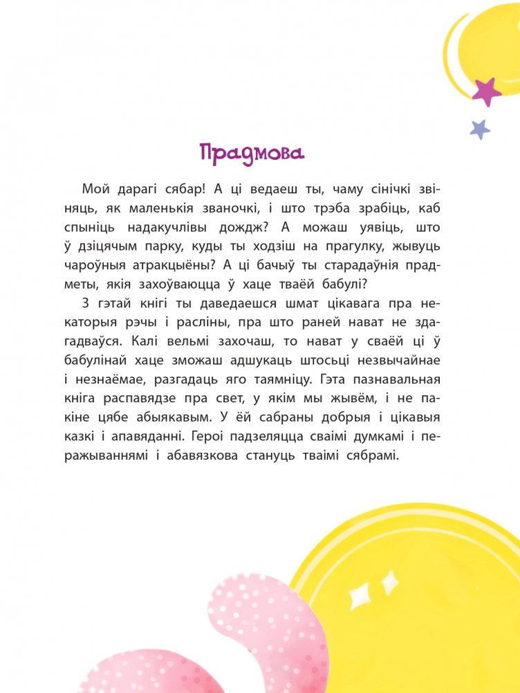 У кнізе сабраны добрыя і пазнавальныя казкі і апавяданні. Іх героі — дзяўчынкі і хлопчыкі, а таксама казачныя персанажы, у ролі якіх выступаюць расліны, жывёлы, розныя бытавыя прадметы, цацкі і чараўнікі. З імі цікава, і яны шмат чаго могуць распавесці, бо ўсе яны вясёлыя, кемлівыя, чулыя да чужой бяды, разумныя і таленавітыя.