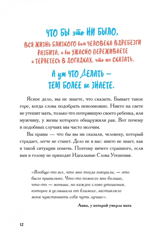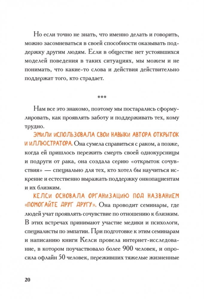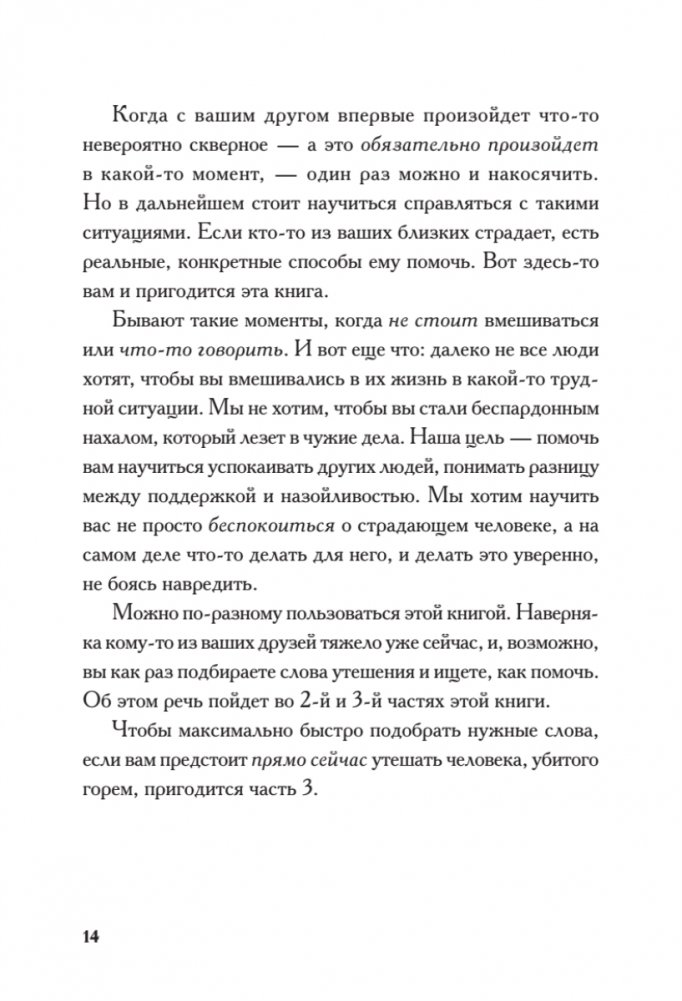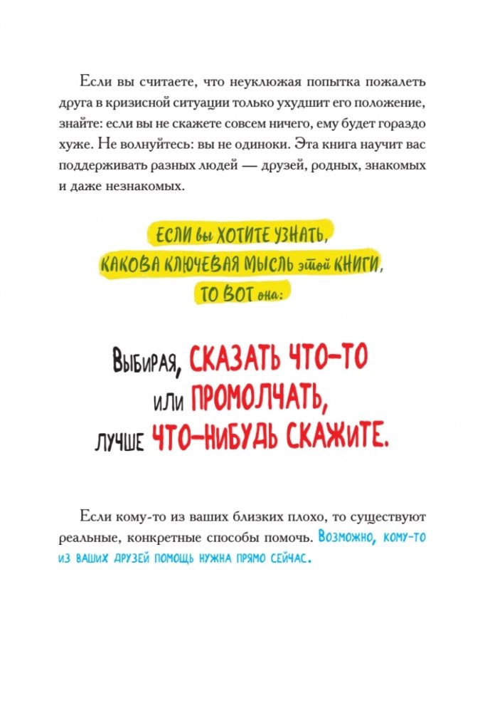 Эта книга - не куриный бульон для души, это виски для раненых. Не ожидайте, что она сможет превратить вас в самого чуткого человека в мире. Но она поможет чувствовать себя уверенно в общении с человеком, который переживает горе, потерю, болезнь или оказался в другой сложной ситуации. Это полезное руководство по эффективному состраданию, которое шаг за шагом поможет преодолеть паралич мыслей в трудное время, чтобы что-то делать (или ничего) со здравым смыслом, а не со страхом.