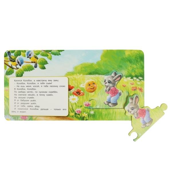 Данная книга выполняет сразу 2 функции: это и книга для чтения, и игра в пазлы. На каждом развороте малыша ждёт интересное повествование, а также яркий пазл с изображением сказочных персонажей. Книжка изготовлена из плотного картона, поэтому мамы могут не опасаться, что ребёнок порвёт странички. Благодаря удобному формату книгу можно взять с собой в дорогу.