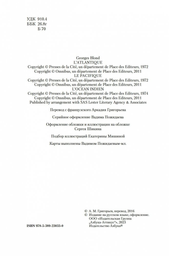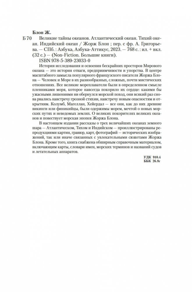 История исследования и освоения бескрайних просторов Мирового океана — это история отваги, предприимчивости и упорства. В центре масштабного замысла популярного французского писателя Жоржа Блона — Человек и Море в их разнообразных, сложных, почти мистических отношениях. Все великие мореплаватели были в определенном смысле пленниками моря, которое навсегда покорило их сердце: какими бы ужасными лишениями ни обернулся морской поход, они всякий раз снова рвались навстречу грозной стихии, навстречу новым опасностям и открытиям. Колумб, Магеллан, Хейердал — все они, как до них древние викинги или финикийцы, были одержимы морем, мечтой о новых морских путях и неведомых землях. О великих покорителях великих океанов и повествует морская эпопея Жоржа Блона. В настоящем издании рассказы о трех величайших океанах земного шара — Атлантическом, Тихом и Индийском — проиллюстрированы репродукциями картин, гравюр, карт, фотографий — исторических изображений, так или иначе связанных с увлекательными сюжетами Жоржа Блона. Кроме того, книга снабжена обширным справочным материалом, включающим карты, словари имен, морских терминов и названий судов и летательных аппаратов.