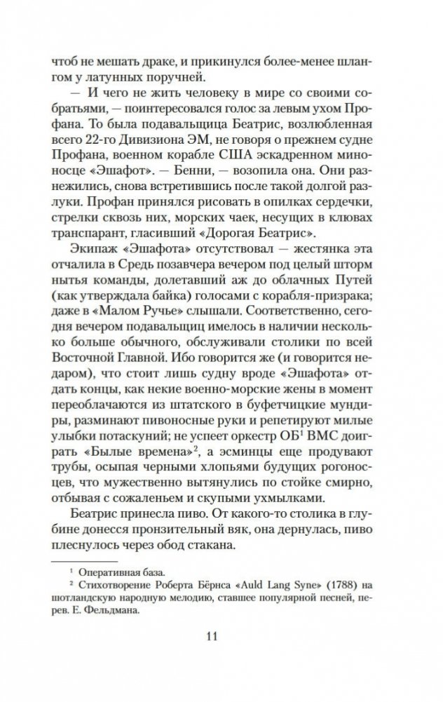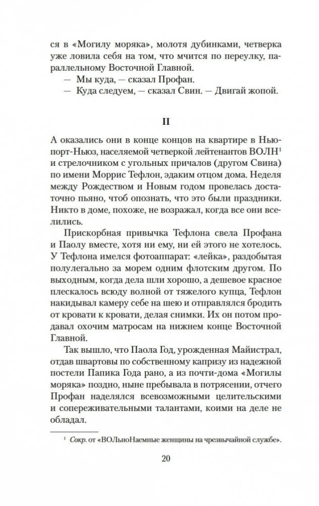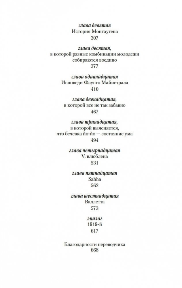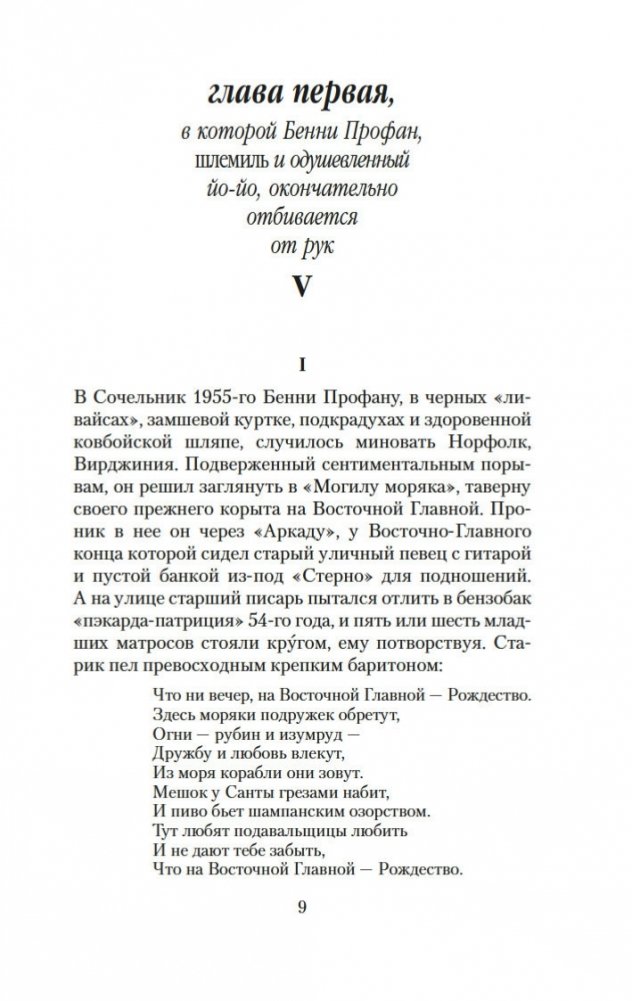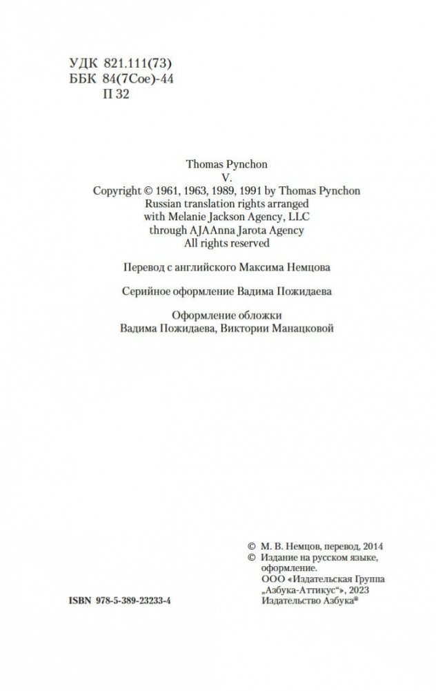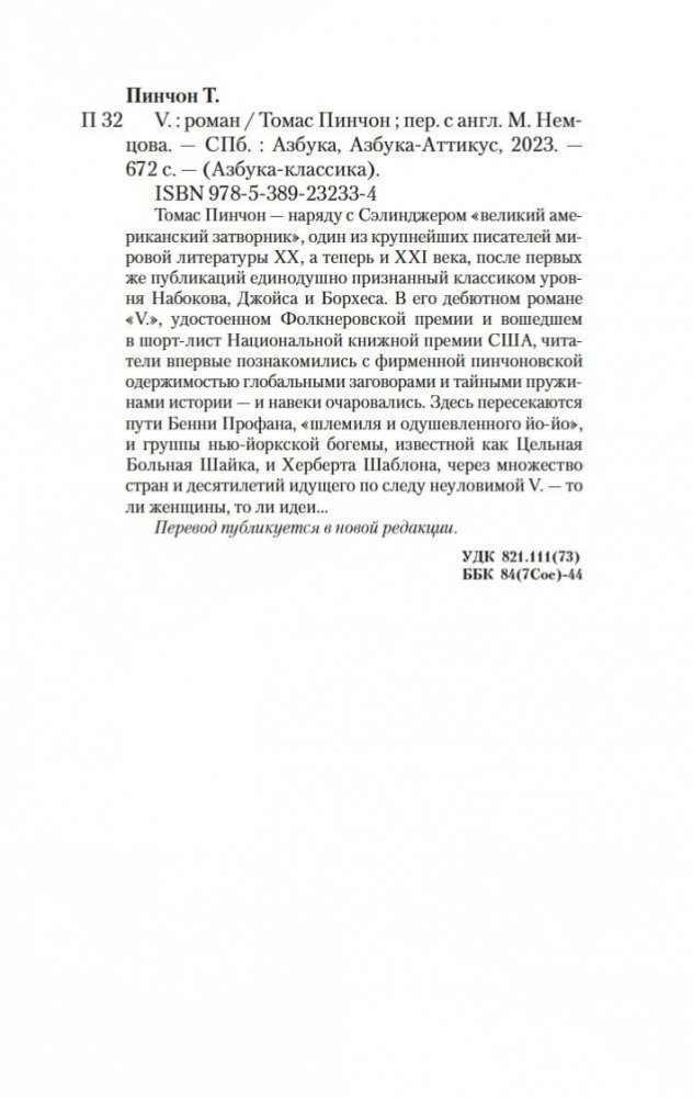 Томас Пинчон — наряду с Сэлинджером «великий американский затворник», один из крупнейших писателей мировой литературы XX, а теперь и XXI века, после первых же публикаций единодушно признанный классиком уровня Набокова, Джойса и Борхеса. В его дебютном романе «V.», удостоенном Фолкнеровской премии и вошедшем в шорт-лист Национальной книжной премии США, читатели впервые познакомились с фирменной пинчоновской одержимостью глобальными заговорами и тайными пружинами истории — и навеки очаровались. Здесь пересекаются пути Бенни Профана, «шлемиля и одушевленного йо-йо», и группы нью-йоркской богемы, известной как Цельная Больная Шайка, и Херберта Шаблона, через множество стран и десятилетий идущего по следу неуловимой V. — то ли женщины, то ли идеи... Перевод публикуется в новой редакции.